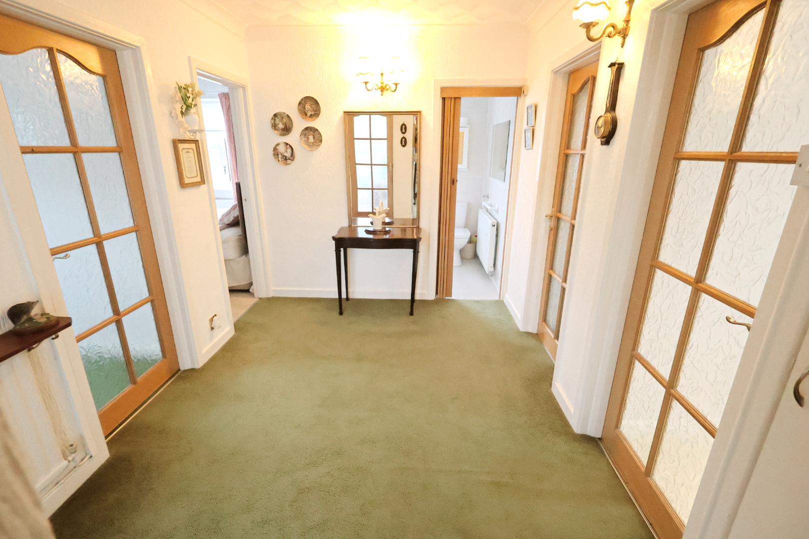 An inviting and spacious entrance hall featuring a radiator and opaque glazed doors opening to the living room, kitchen, shower room, and all three bedrooms. There are two built-in cloak/storage cupboards with luggage cupboards above.