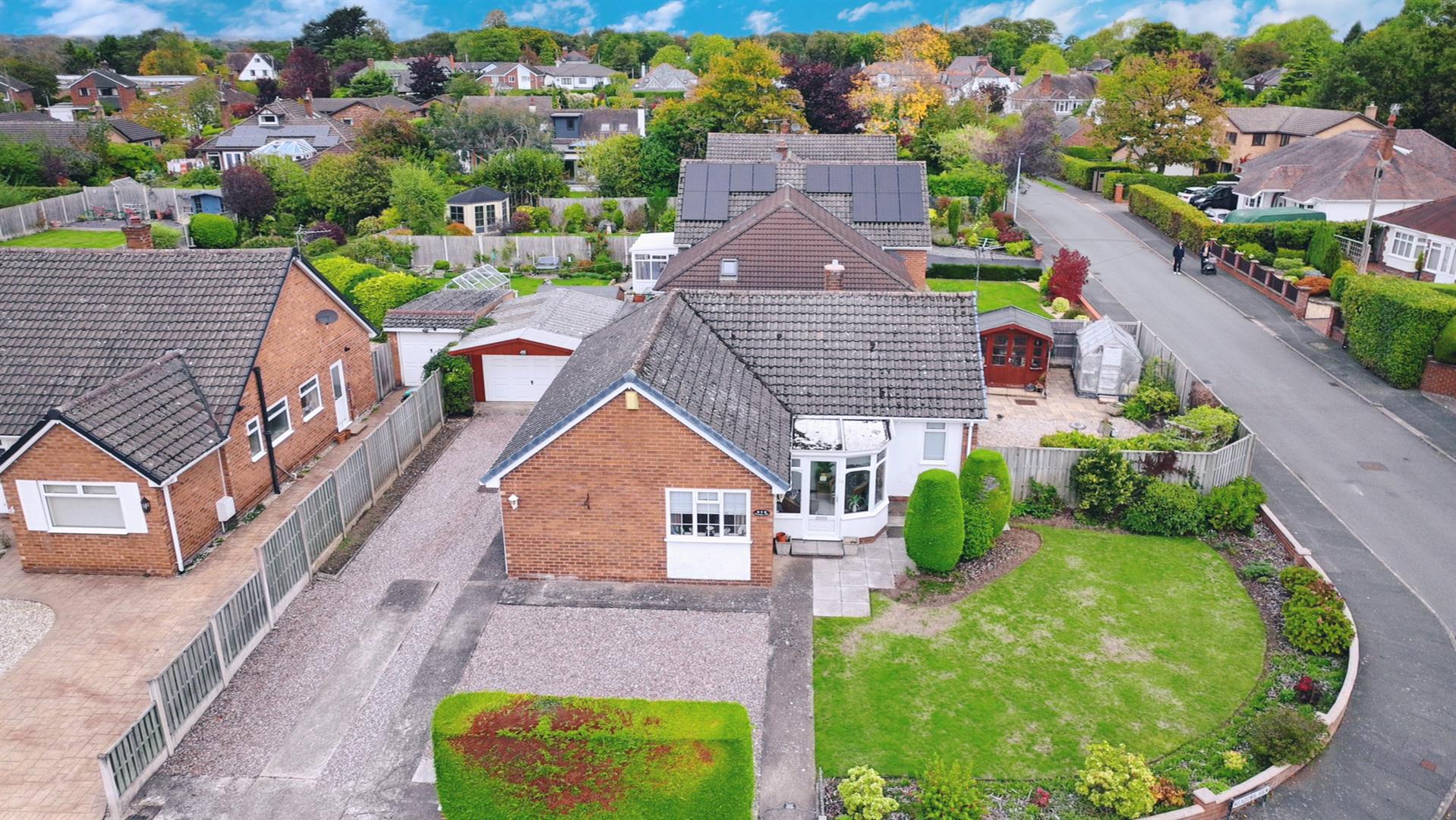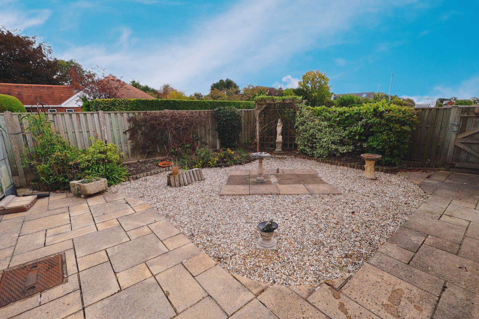 The property sits on an attractive corner plot with a lawned garden and shrub borders. There is also a gravelled area providing overflow parking, along with a gravel driveway extending along the left-hand side of the property to the garage. Ample exterior lighting is provided. Timber gated access to the side and rear gardens can be gained from either side of the bungalow. The rear garden is designed for low maintenance, being predominantly paved with gravelled areas, raised planters, shrub borders, a timber summerhouse, and a greenhouse. There is also an external water supply and lighting, all enclosed by timber fence panels.