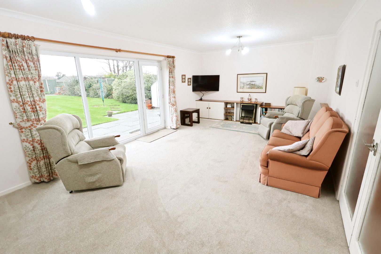 A generous living space with two radiators, fitted base cabinets, and a UPVC double-glazed picture window with integrated door opening to the rear garden.
