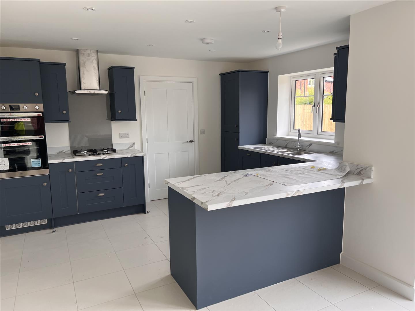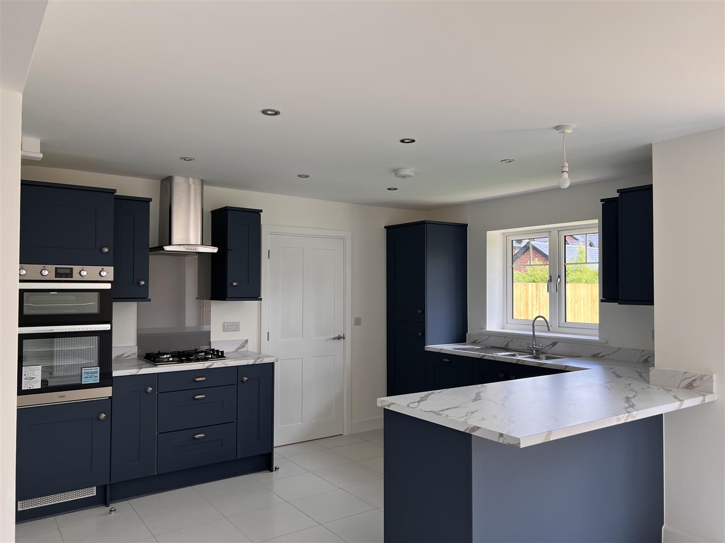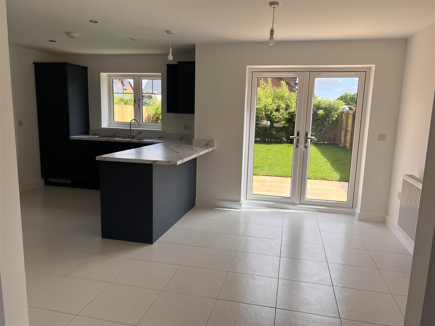With a window to the rear, the modern contemporary kitchen is fitted with a with double oven, fridge freezer, dishwasher, gas hob and extractor fan, stainless steel double sink with mixer tap and drainer along with a range of base and wall units with contrasting worktops over. Tiled floor and spotlighting. A door leads to the utility room. The dining room has space for a dining table and chairs, double doors to the outside and a radiator.