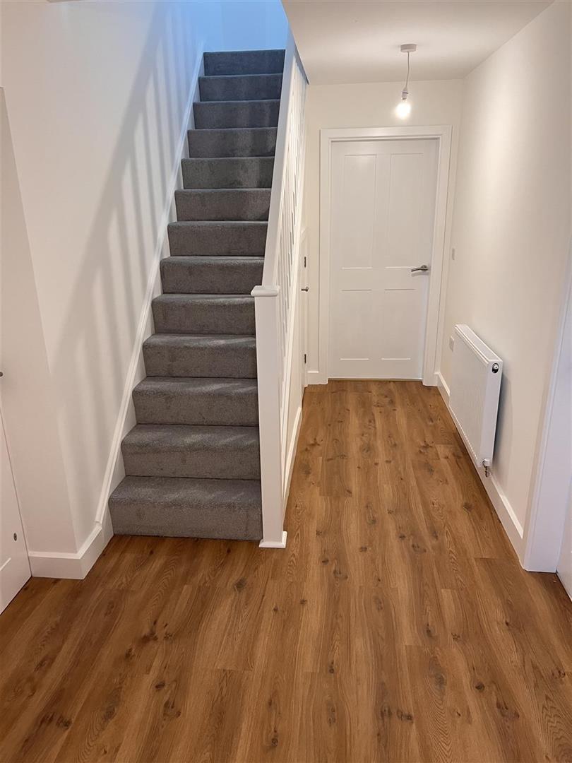 A spacious inner hallway with under stairs storage cupboard, stairs to the first floor, wooden flooring and doors to the downstairs rooms.