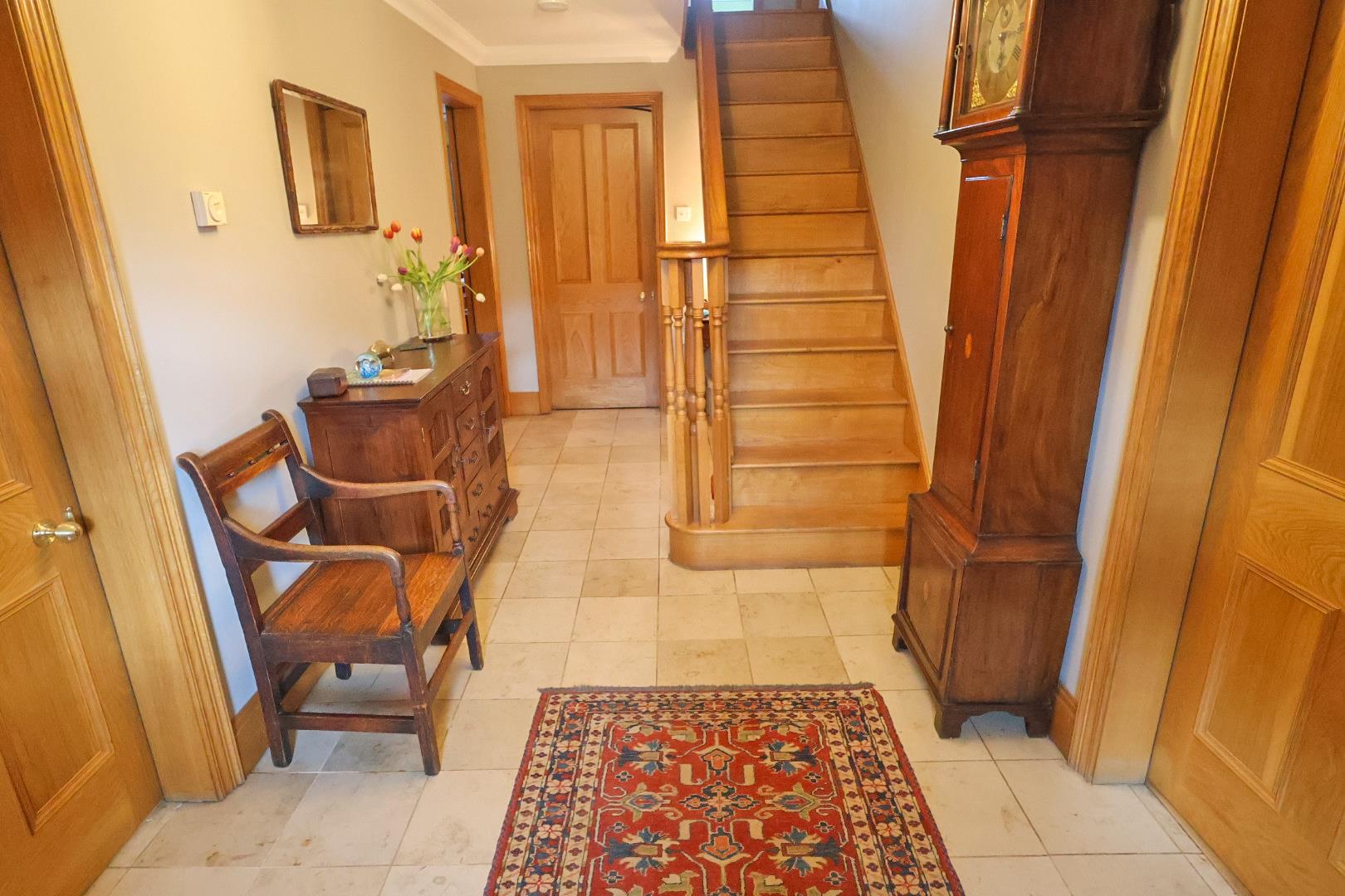 The property is entered via a painted double-glazed light oak door opening into an impressive and welcoming entrance hall with natural limestone tiles with underfloor heating. Light oak stairs with banister and spindle balustrades rise to the first floor accommodation. Light oak internal doors lead to the living room, dining room, kitchen, and rear hallway,