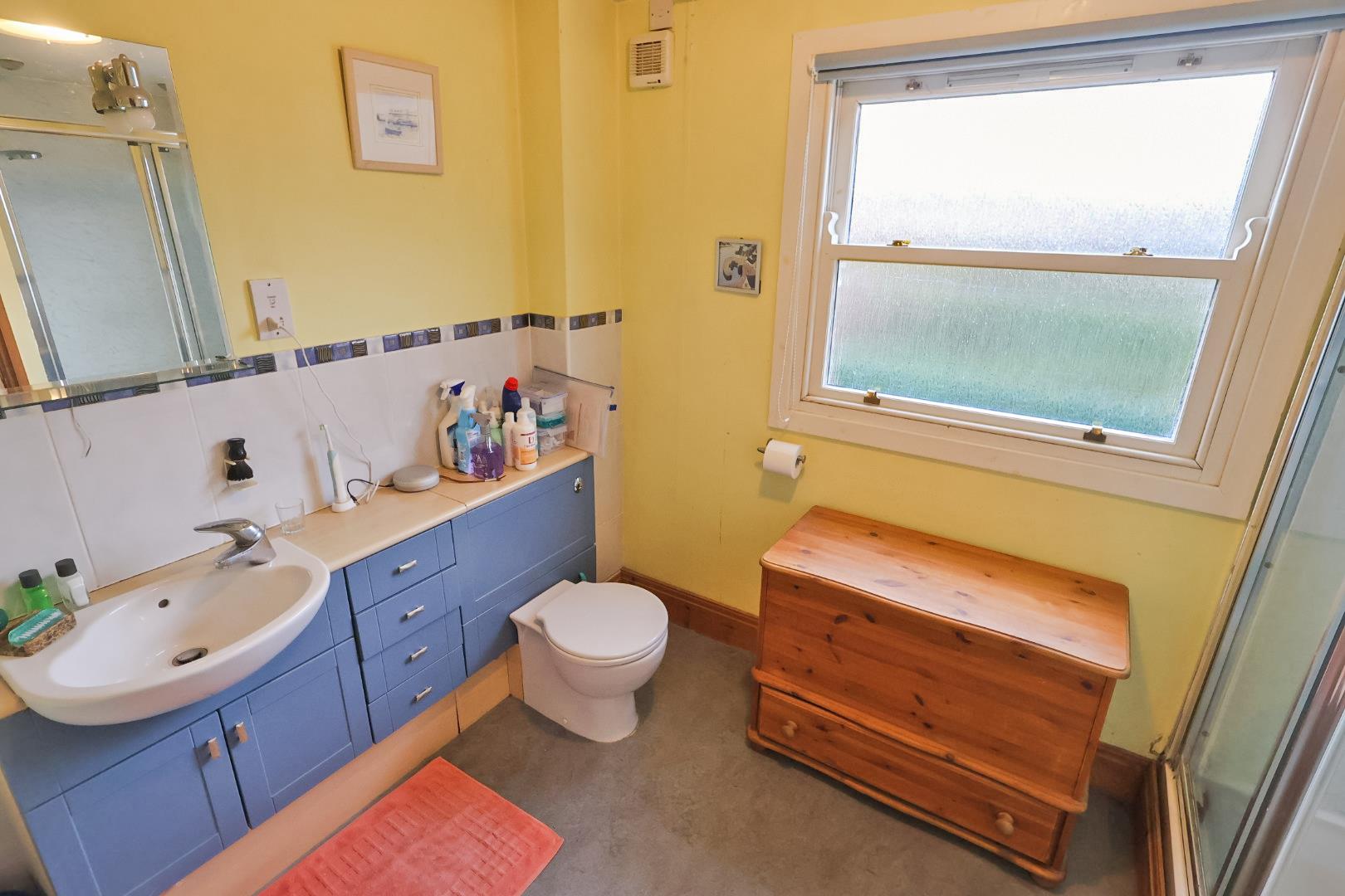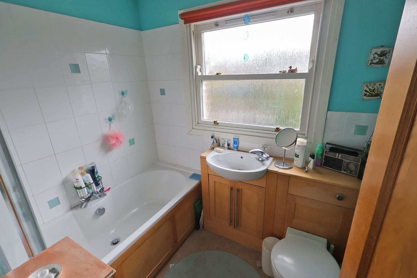 The bathroom is appointed with a panelled bath with central mixer tap and thermostatic shower with folding screen above. Wood-grain effect vanity unit housing low-level WC and wash hand basin with mixer tap. Partially tiled walls, chrome heated towel rail and opaque sash window to front elevation.