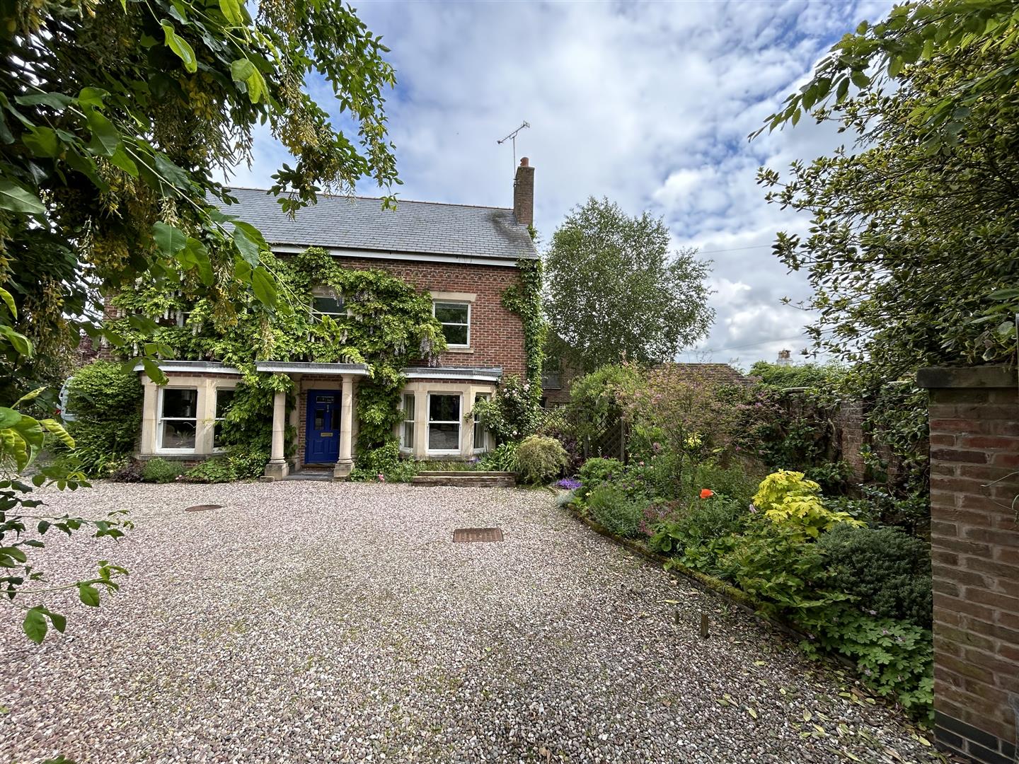 The front of the property is approached via double iron gates opening onto ample gravel off-road parking for several vehicles, surrounded by flower beds and planters stocked with a variety of shrubs and trees. A brick block driveway provides access to the detached double garage. External lighting is also available.
