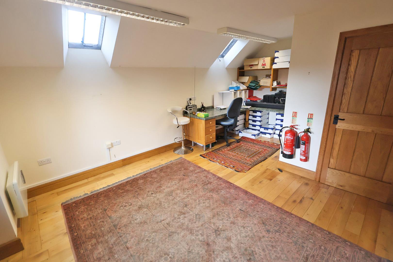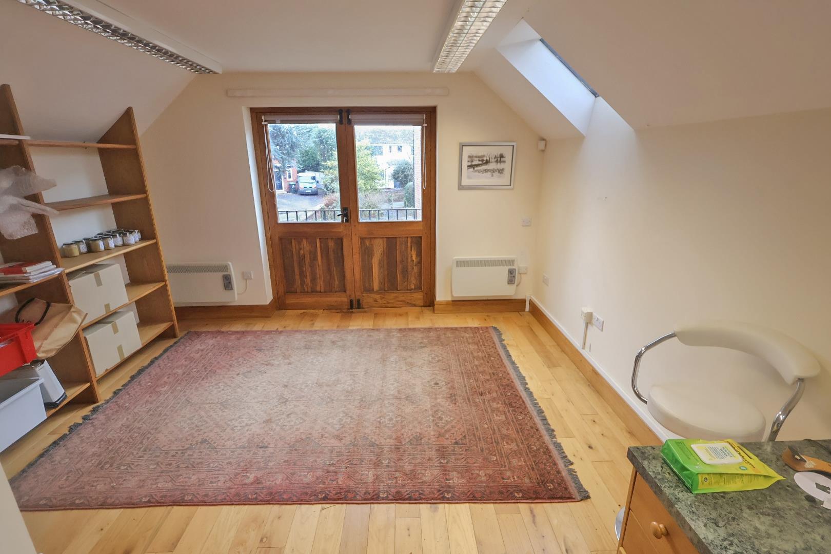 With exposed floorboards, two electric wall heaters, two skylights, fitted corner desk and shelving, and glazed double doors opening onto a Juliet balcony.