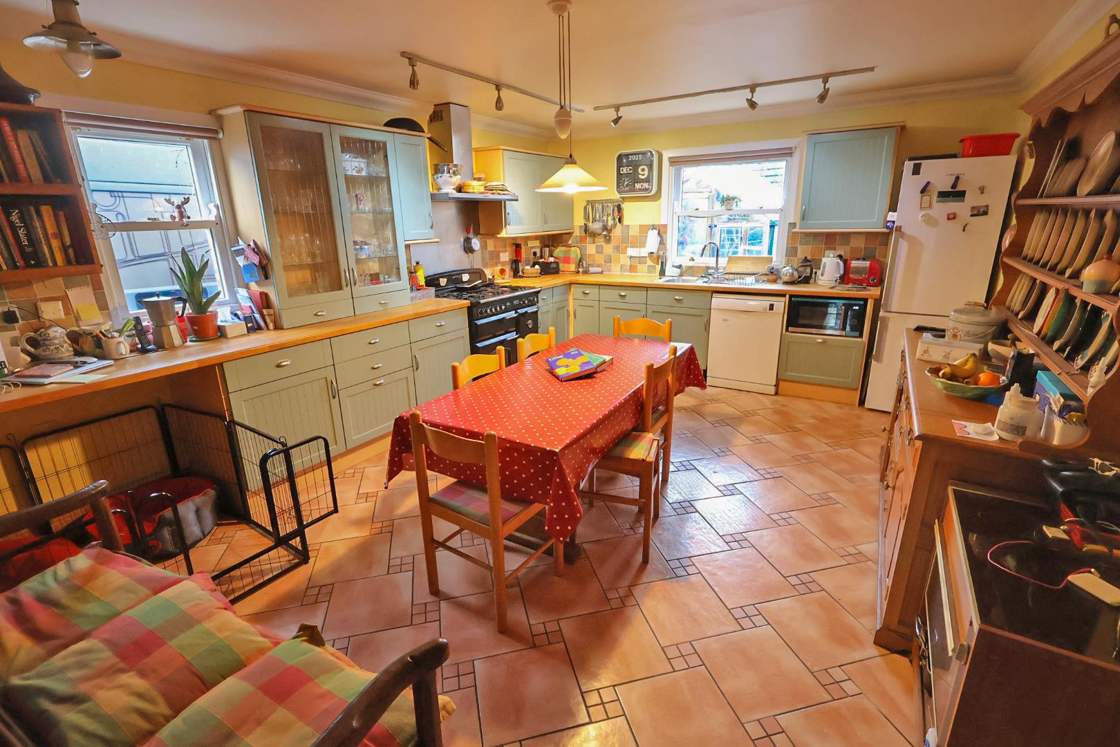 The kitchen is Fitted with a range of wall, base and drawer units complemented by display cabinetry, ornamental handles and solid wood work surfaces incorporating a stainless steel one-and-a-half bowl sink unit with mixer tap. There is space for a range cooker with extractor hood above, and space and plumbing for a washing machine. Ceramic tiled underfloor heating continues throughout, with windows to the side and rear elevations.