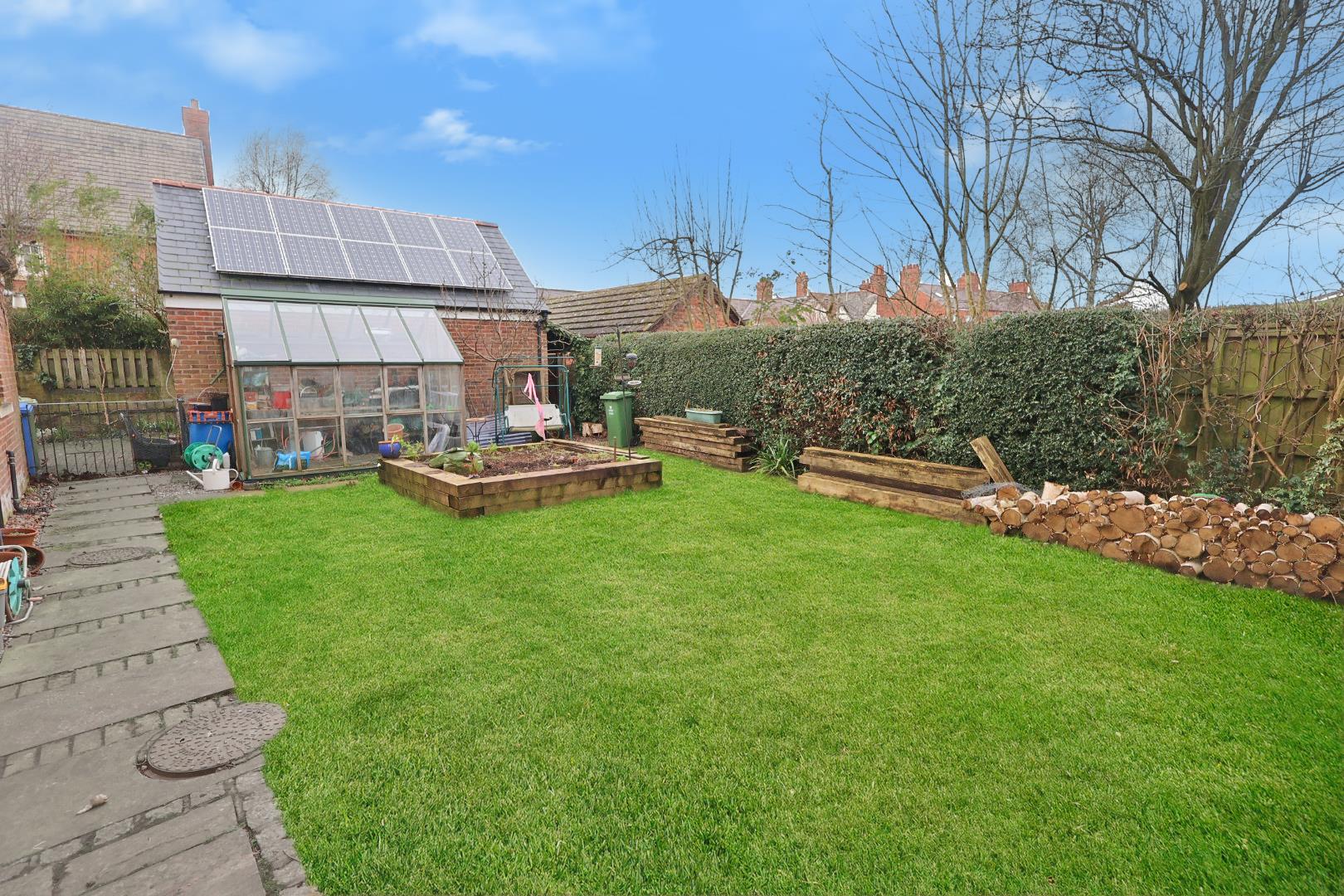 The rear garden is accessed via a timber gate to one side and iron gate to the other. There is a paved patio area with an electrically operated awning, planted borders and a predominantly lawned garden with sleeper-raised vegetable bed and a greenhouse. There is a Pergola to the side of the property along with external lighting and a water supply.