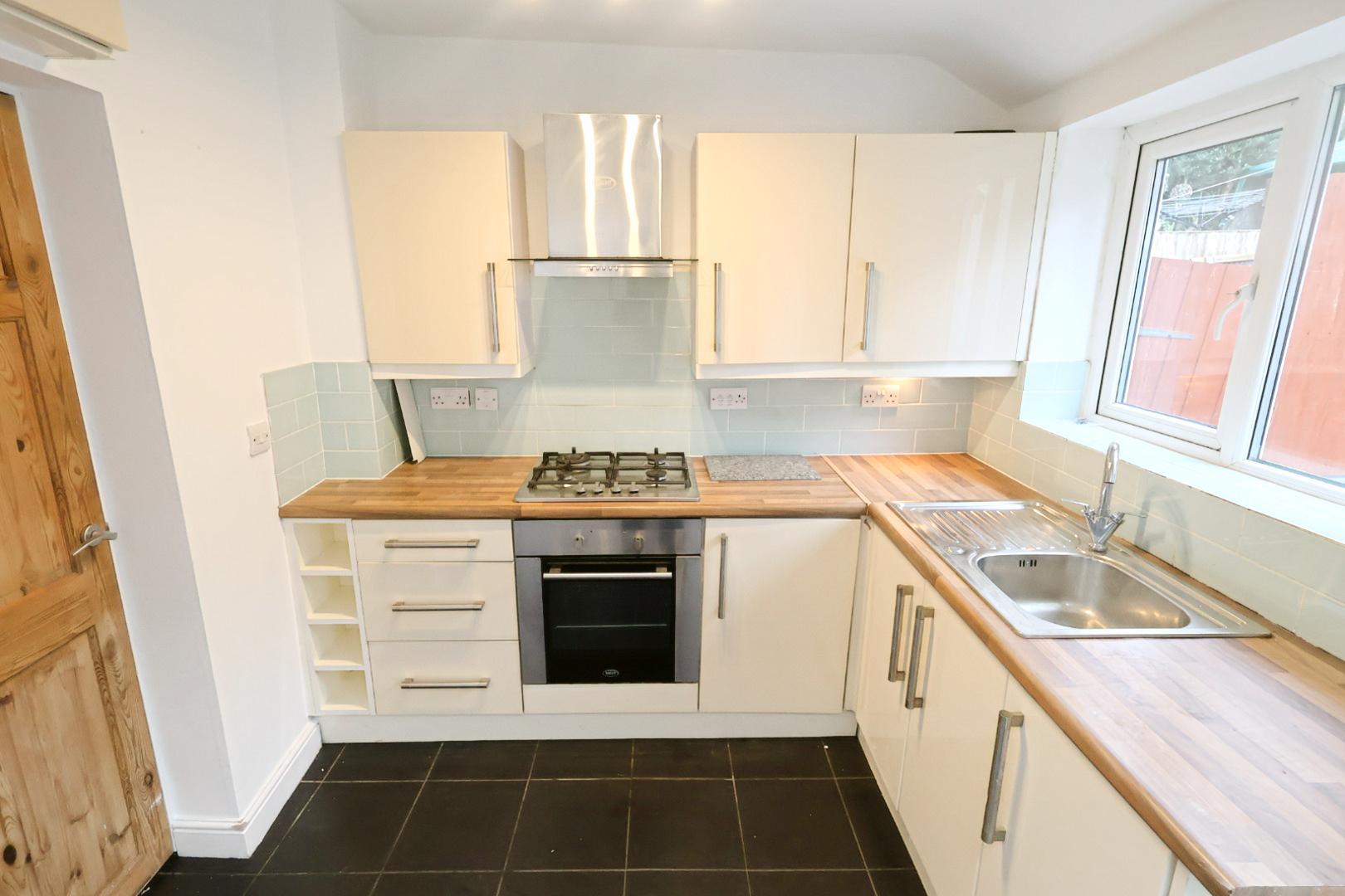 Fitted with gloss wall, base and drawer units complemented by stainless steel handles and a wood-grain effect worksurface housing a stainless steel single drainer sink with mixer tap and tiled splashback. Integrated appliances include a stainless steel oven, hob and extractor hood, with space for a tall fridge-freezer. The floor is ceramic tiled, and there is a radiator. A built-in cupboard houses the Ideal gas combination boiler. A window faces the rear elevation, with a double-glazed skylight set into the ceiling. A UPVC double-glazed door opens out to the rear garden.