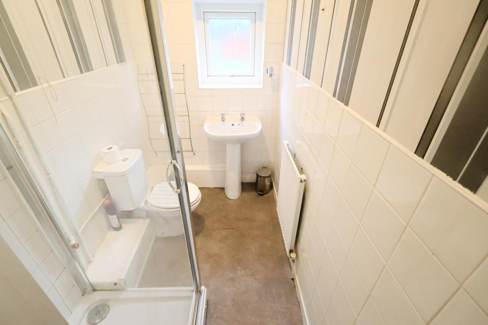 Fitted with a three-piece white suite comprising a corner shower enclosure with thermostatic control, dual-flush low-level WC and pedestal wash hand basin. Partially tiled walls, extractor fan and an opaque window to the rear elevation.