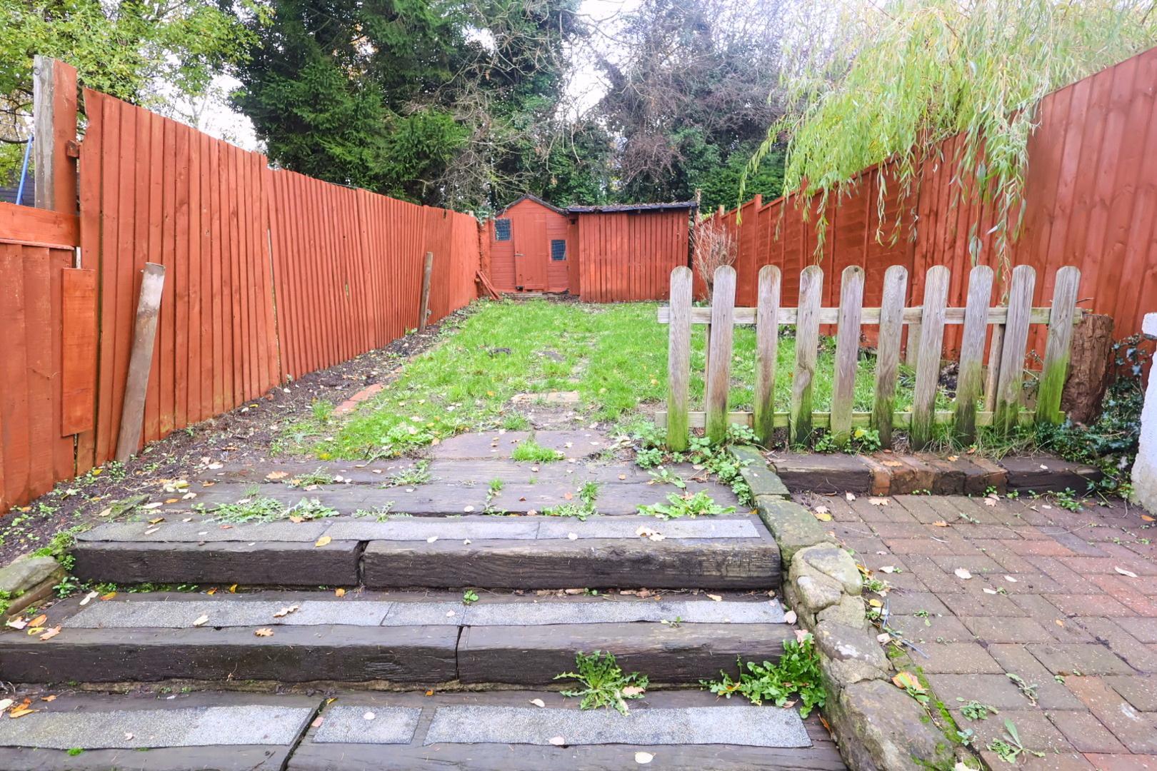 To the front of the property is a lawned garden with a shared pathway leading to the front door. The rear garden features a brick-block lower patio area with outbuildings requiring attention. Wooden sleeper steps rise to an upper lawned tier of garden, with a timber shed and woodland beyond.