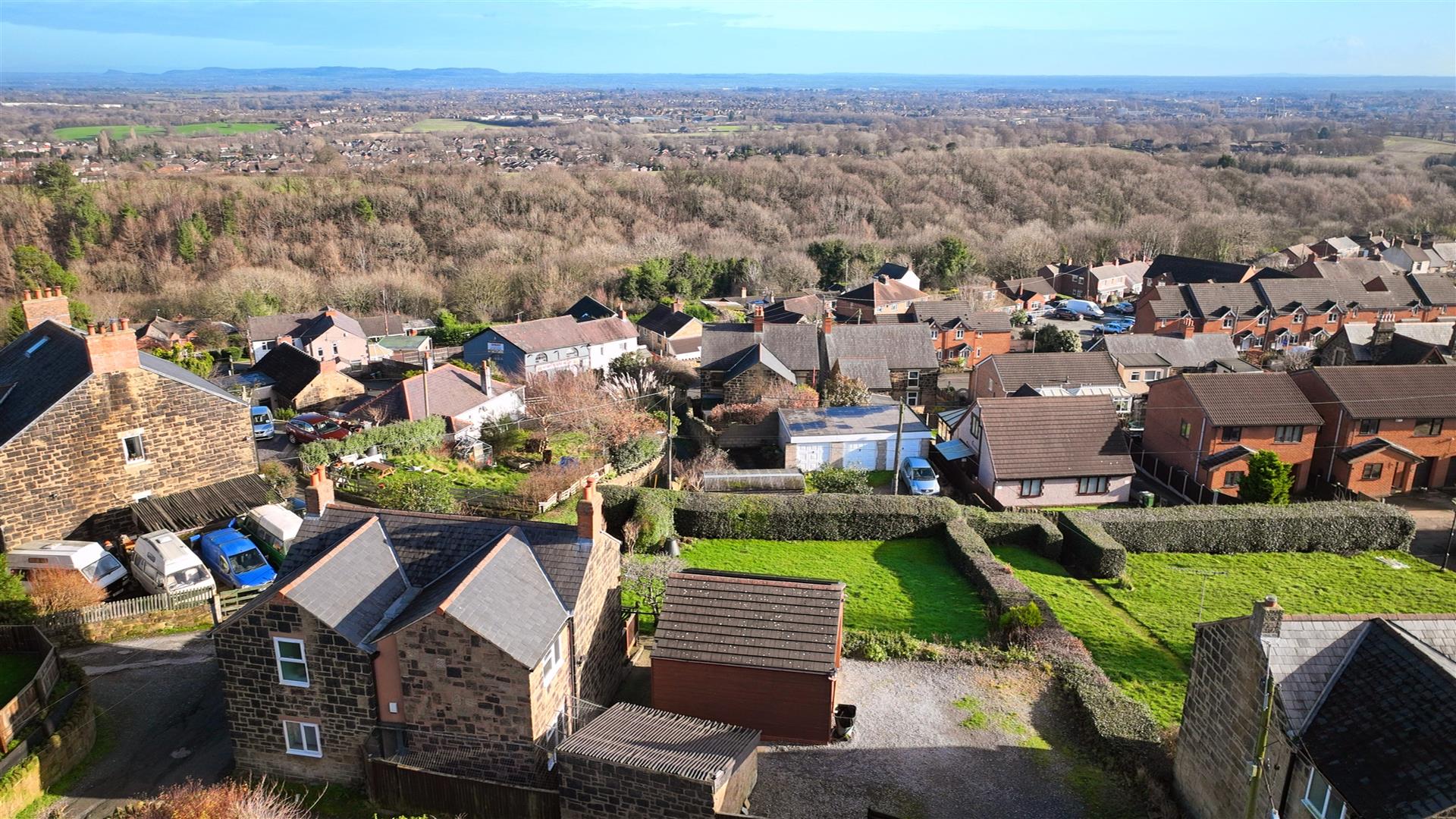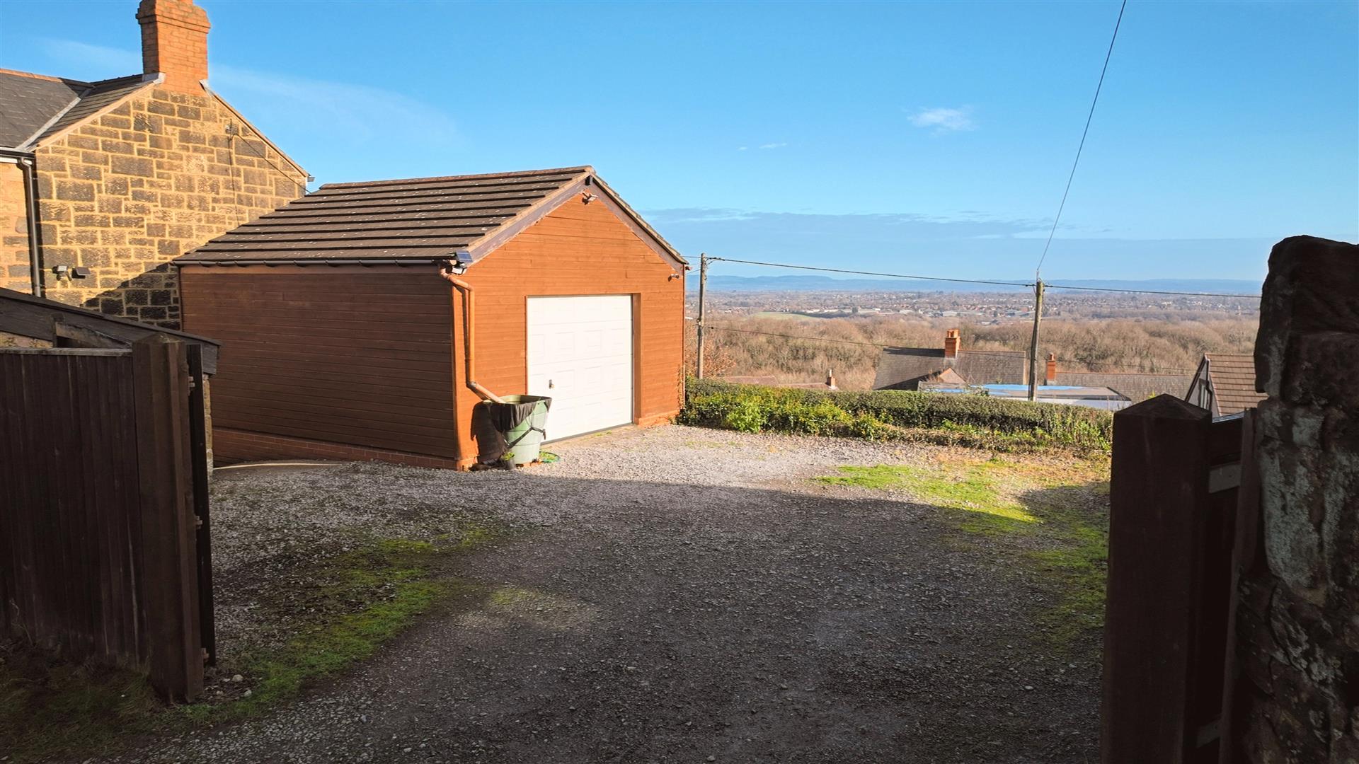 Offering the most stunning elevated views, the property is entered through an iron gate which opens onto a pathway leading to the front door. There is a decked patio and golden gravel patio on either side. The garden is substantial, being predominantly laid to lawn with a variety of plants, shrubs, and trees, all enclosed by hedged boundaries. Double timber gates open to ample gravel off-road parking for several vehicles and provide access to the detached double garage. To the rear of the property is a pathway leading to the back door and offering access to a stone outbuilding.