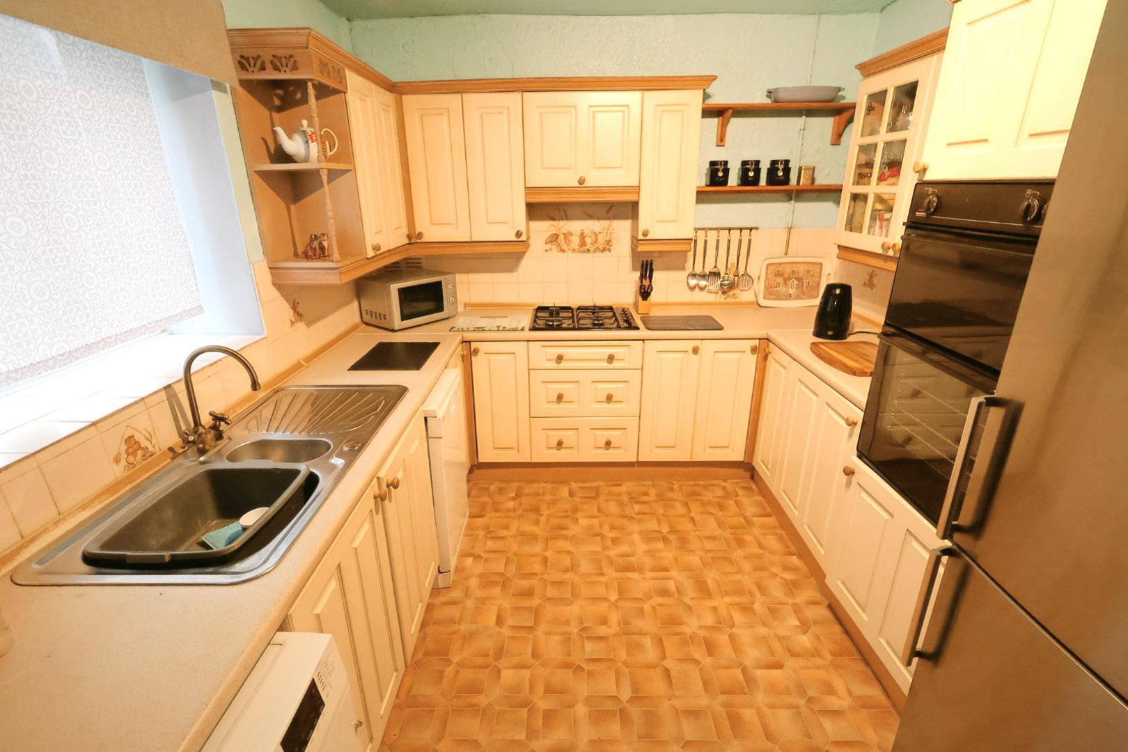 Fitted with a range of cream wall, base, and drawer units, complemented by a display cabinet and ample work surface space. There is a stainless steel one-and-a-half bowl sink unit with mixer tap and tiled splashback. Integrated appliances include an oven and grill, with a gas hob and extractor hood above. There is space and plumbing for a washing machine and slimline dishwasher, a radiator, and a window to the rear elevation. A stripped pine door opens into the rear hallway.
