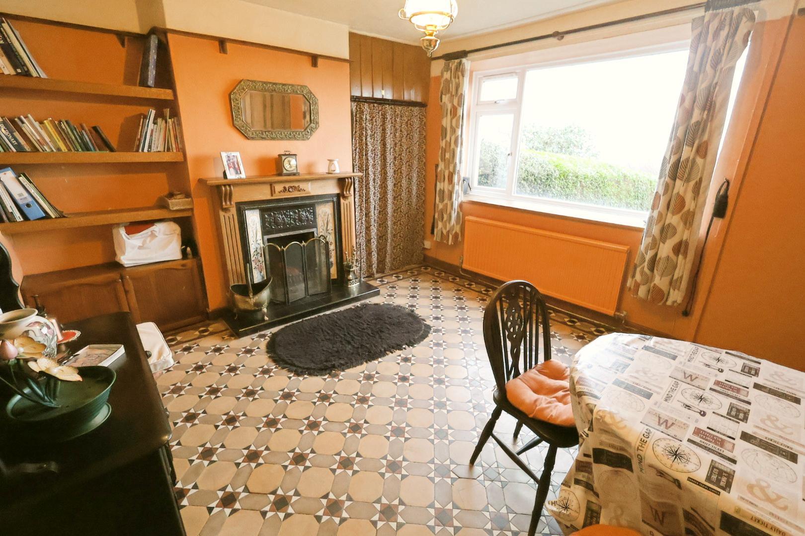 A double-aspect room with windows to the front and side elevations, a radiator, partially glazed fitted wall units, and a cast-iron open fireplace with tiled hearth.