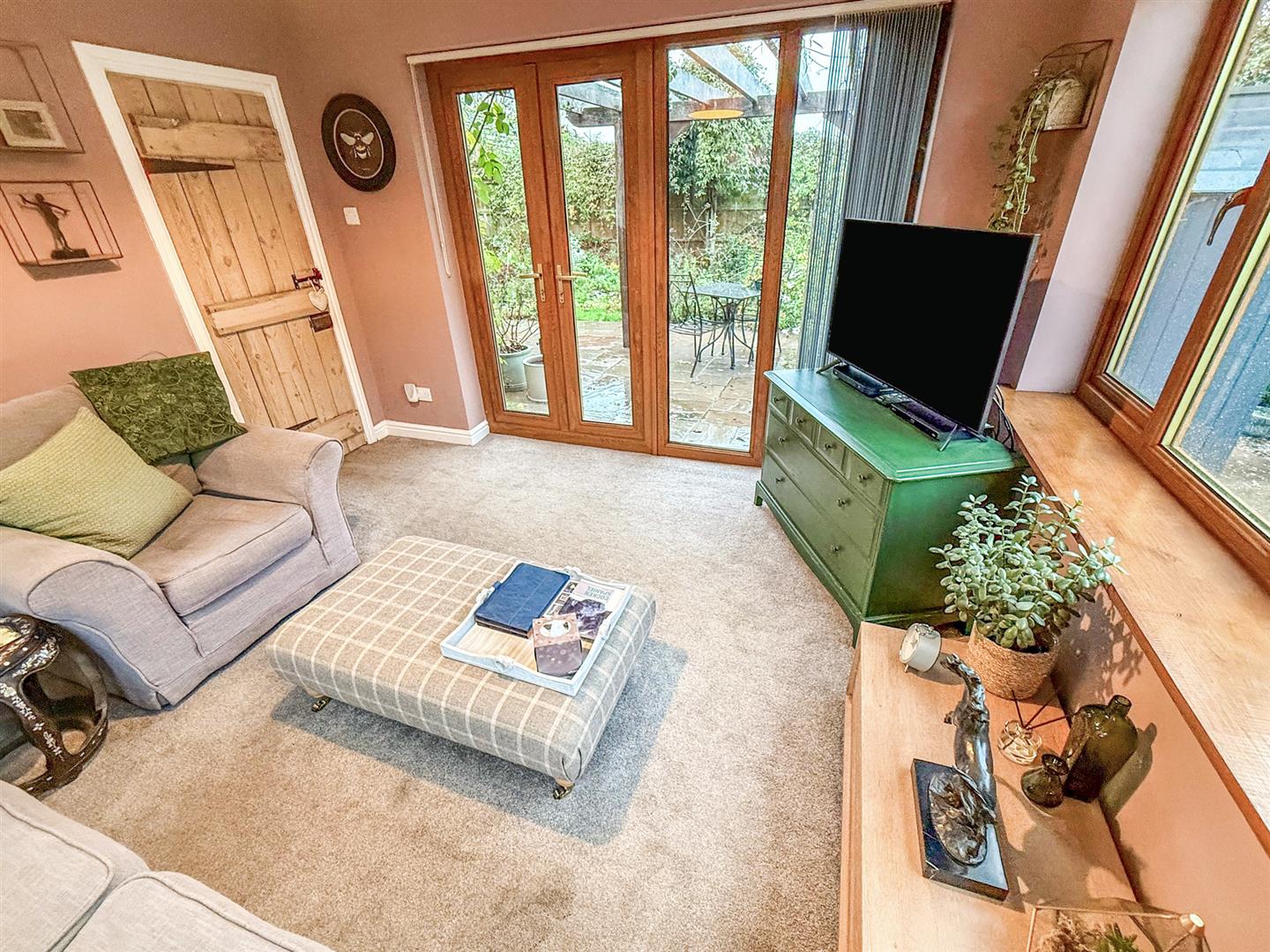 The sitting room is a lovely reception space having a modern vertical radiator, windows to both sides and French doors leading onto the garden.