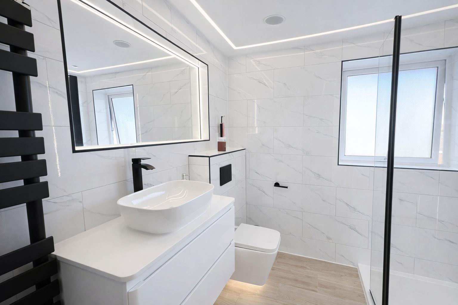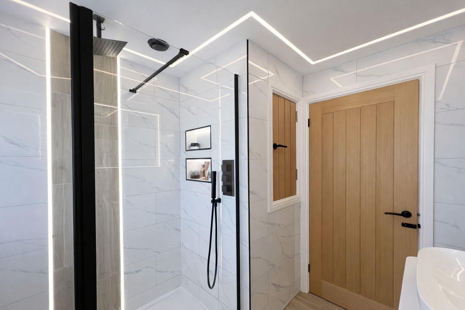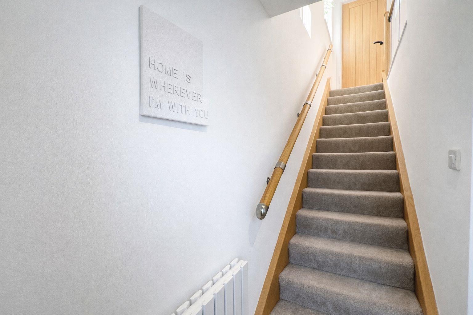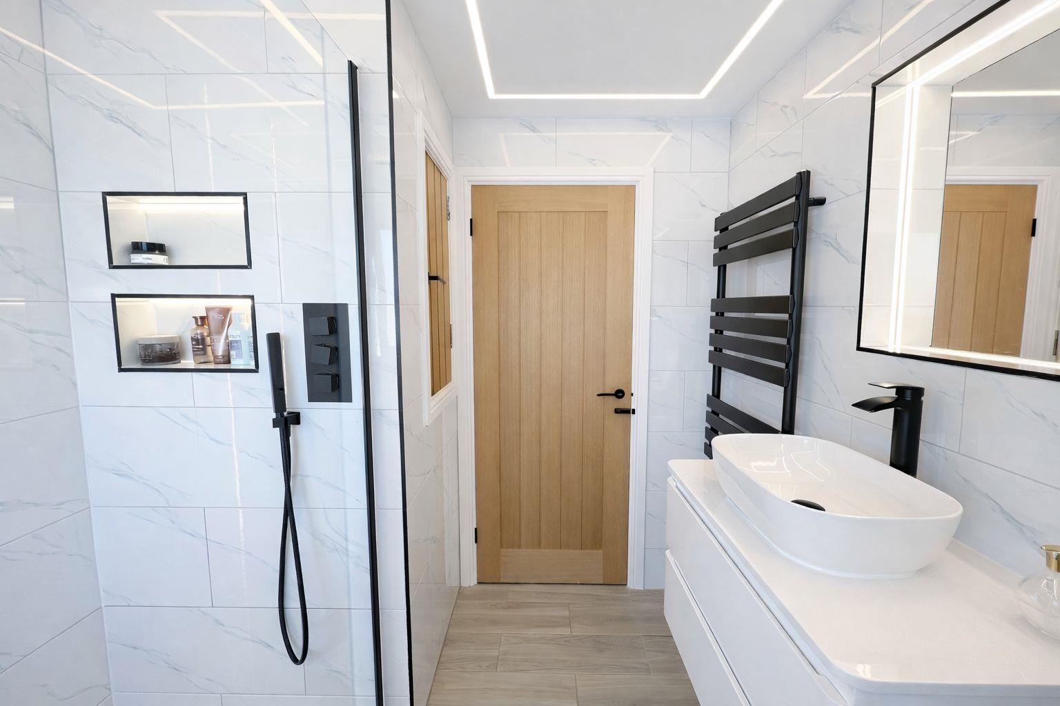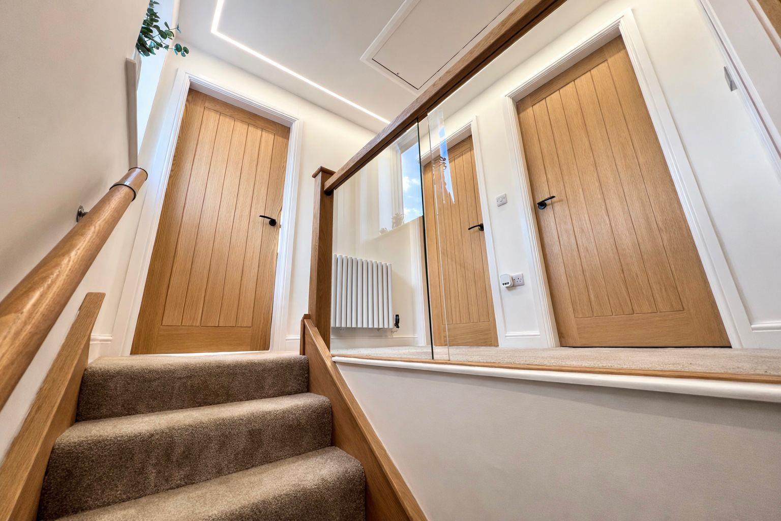 A standout feature of the home, incorporating solid oak cladded runners and a contemporary oak and glass banister. The stairs and landing are carpeted for added comfort while bespoke plastered-in LED profile ceiling lighting enhances the space with a sleek, ambient finish. Solid oak internal doors, finished with black handles and matching hinges, continue the modern design theme throughout. The landing features a contemporary designer radiator and a convenient pull-down loft ladder, providing straightforward access to the attic where a newly fitted Baxi boiler is located.