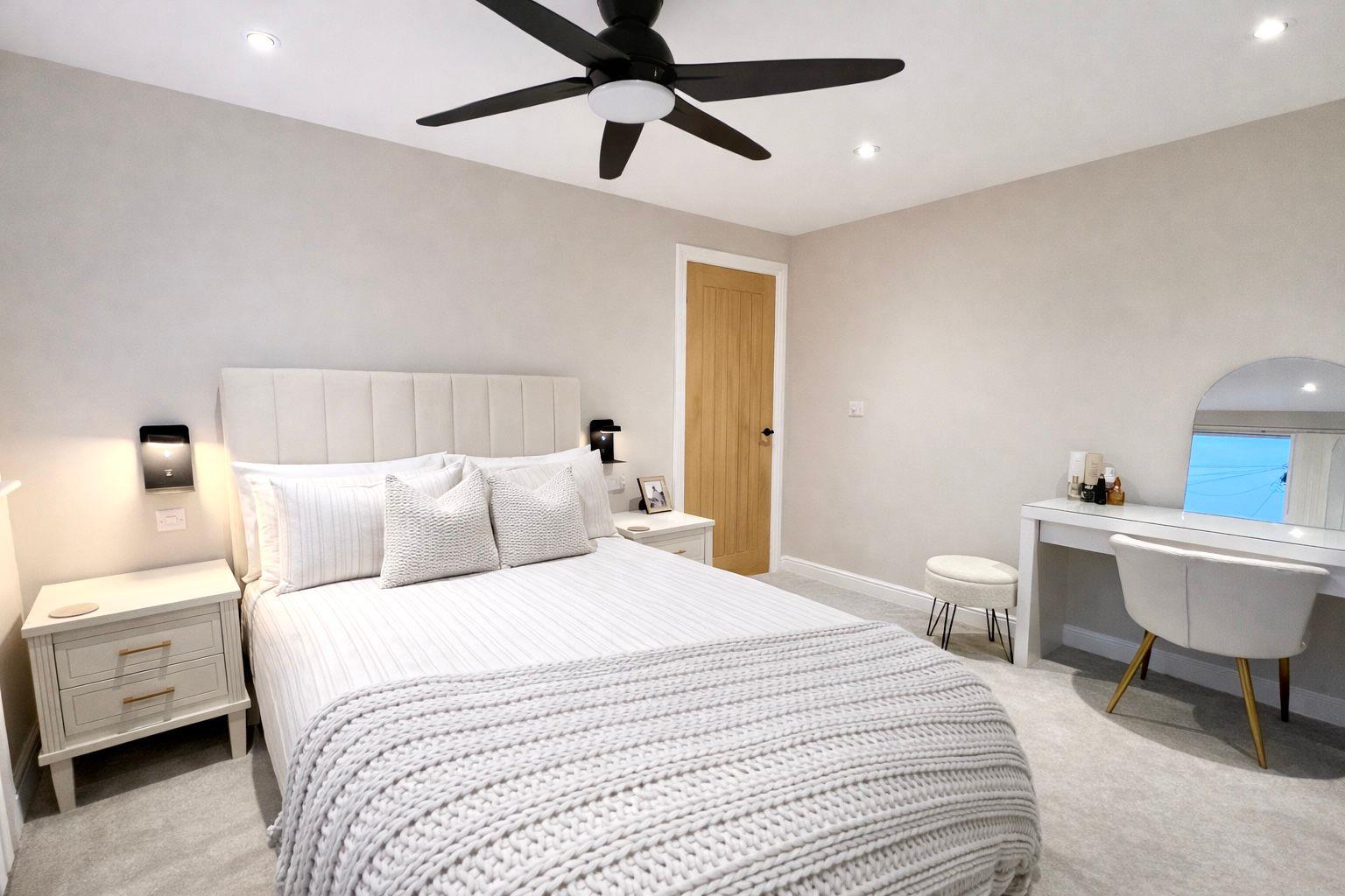 A spacious bedroom featuring a large designer radiator and carpeted flooring. The room includes sockets and data for a wall-mounted TV, four ceiling spotlights on a dimmer switch, and a ceiling fan. Five double sockets and two additional USB double sockets provide excellent practicality.