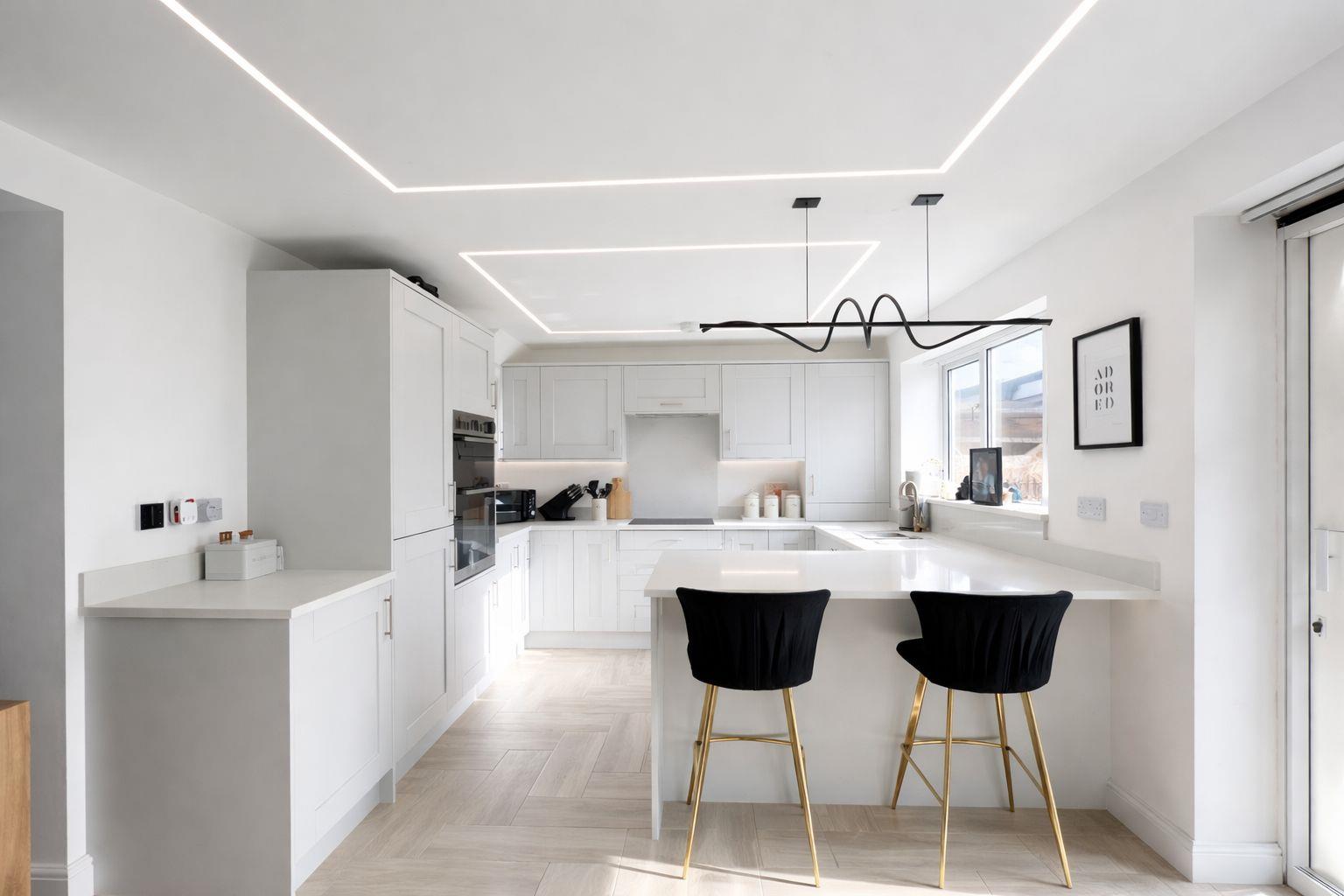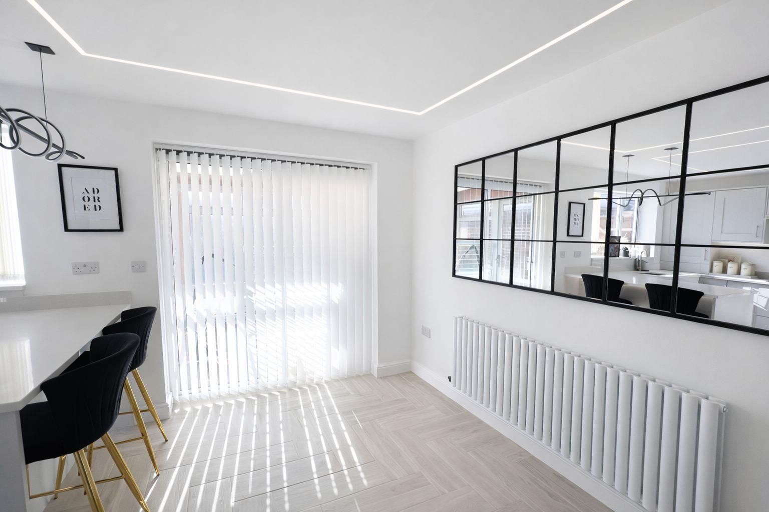 Integrated appliances include a washing machine, dishwasher, fridge freezer, oven and grill, cooker hood, and a four-ring induction hob. Bespoke plastered-in LED ceiling lighting and bespoke LED under-cabinet lighting enhance the clean, contemporary finish. A large designer radiator serves the dining area.