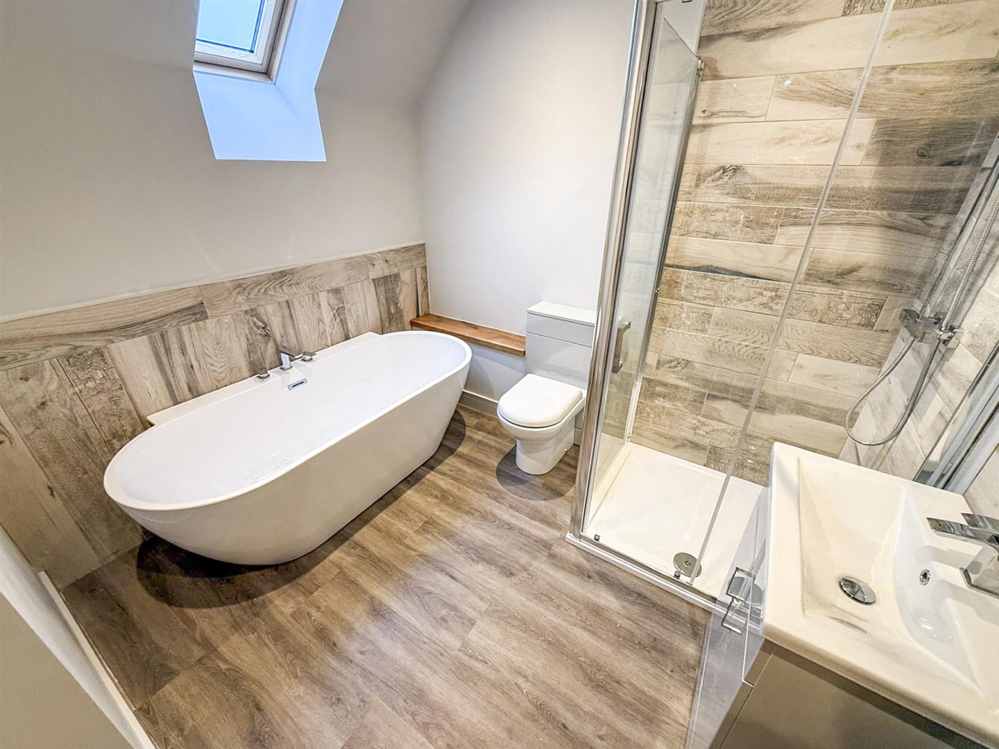 The bathroom has been fitted with a modern suite comprising a free standing deep bath, corner shower cubicle with mains shower and part tiled walls. There is a Velux window, wood style floor, low level WC, a wash hand basin on a vanity unit with mixer tap over and spot lights. With a corner shower cubicle and mains shower and part tiled walls with feature tiling.