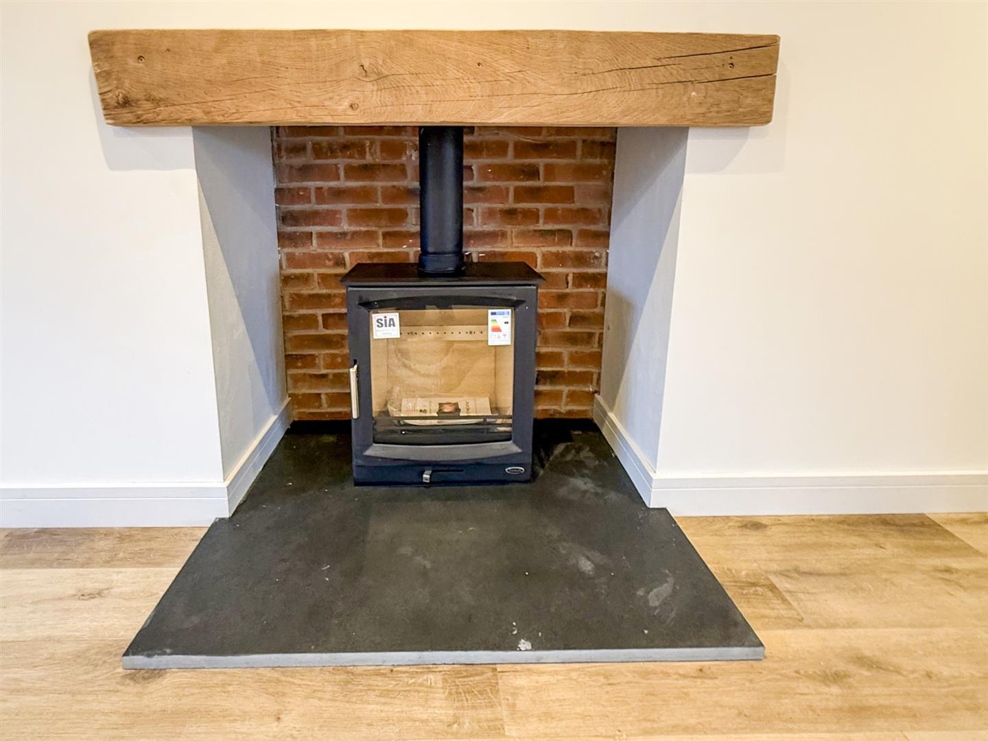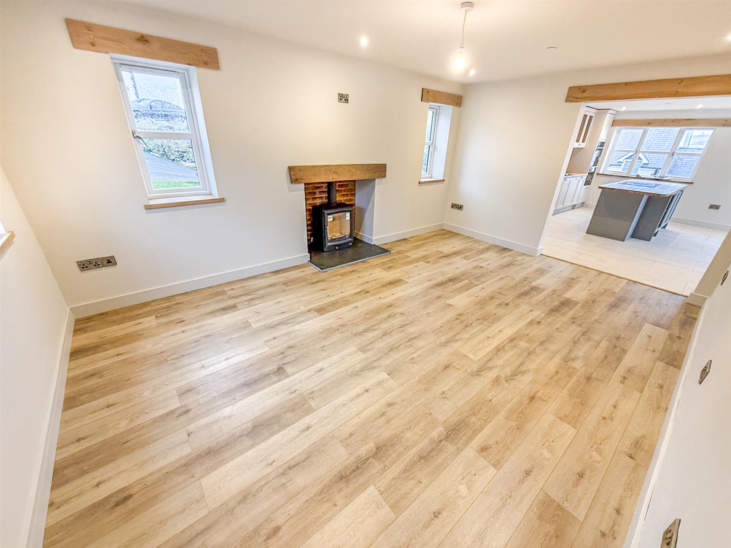 The bright and spacious lounge has dual aspect windows to the front and side aspects, wood flooring with underfloor heating and an inset wood burning stove with an oak beam over and an arch opening to the kitchen.