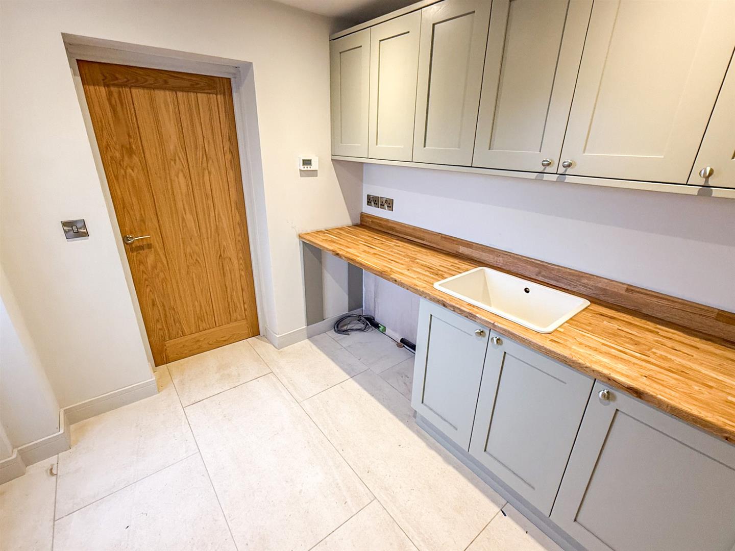The utility comprises a range of base and wall units with worktop over, single inset sink, tiled flooring, space and plumbing for washing machine or tumble dryer. A door leads through to the garage and a part glazed door leads to the patio area at the rear.