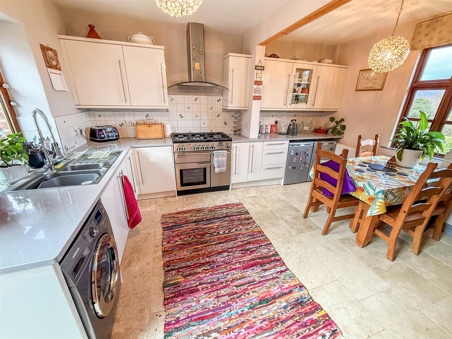 This good sized room features a range of wall and base units with Quartz worktop over and tiled surround. Rangemaster 5 ring oven and chimney extractor fan, stainless steel sink and drainer with mixer tap over. Space and plumbing for washing machine and appliances. Understairs storage cupboard, window to the rear overlooking countryside views and two radiators. A door leads through to the conservatory.