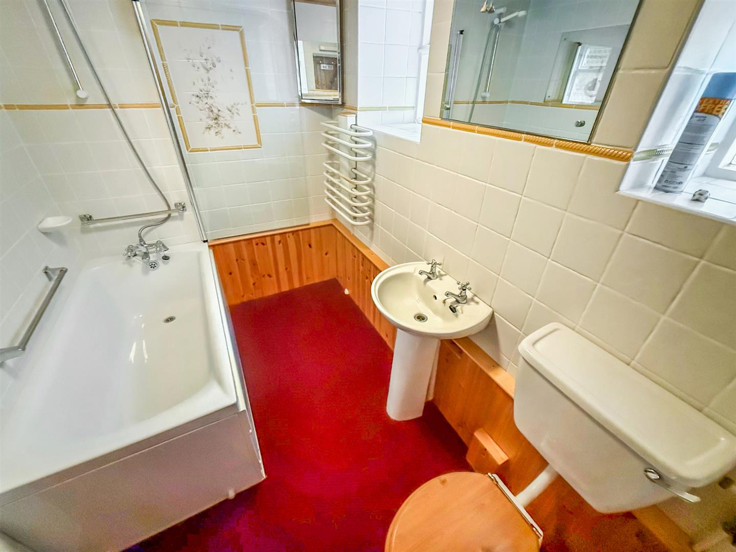 The ground floor bathroom has two windows to the rear, panelled bath with mixer tap, shower head and a glass screen. A wash hand basin, w/c, heated towel rail, electric wall heater, part tiled and part panelled walls and shaver light.