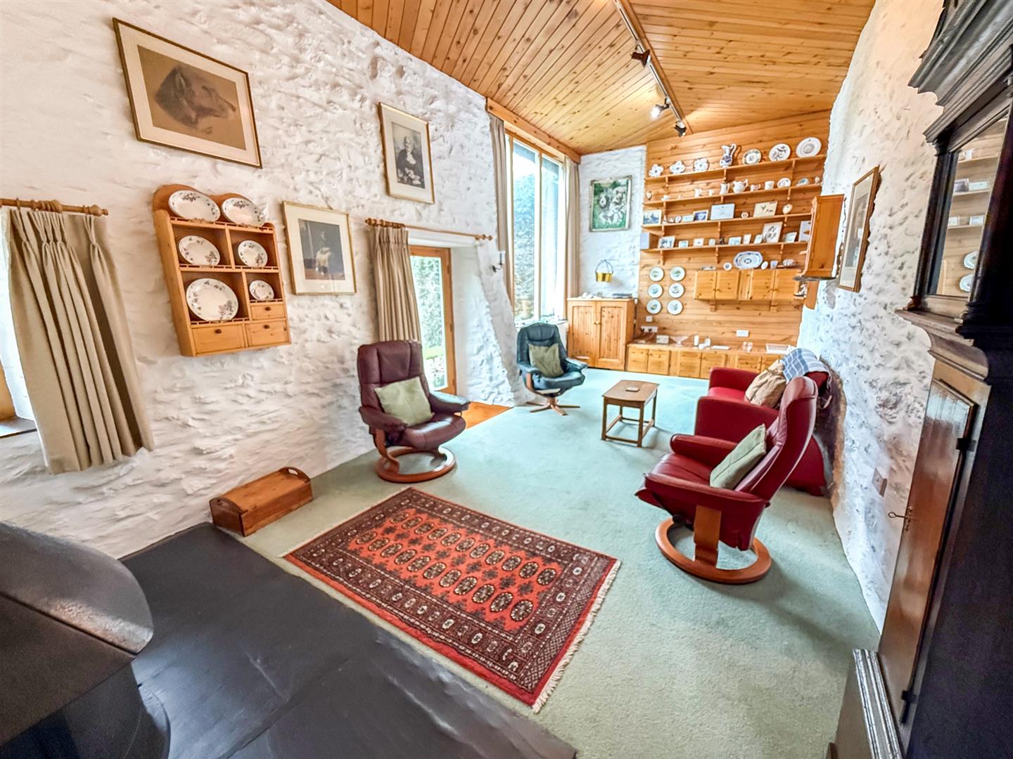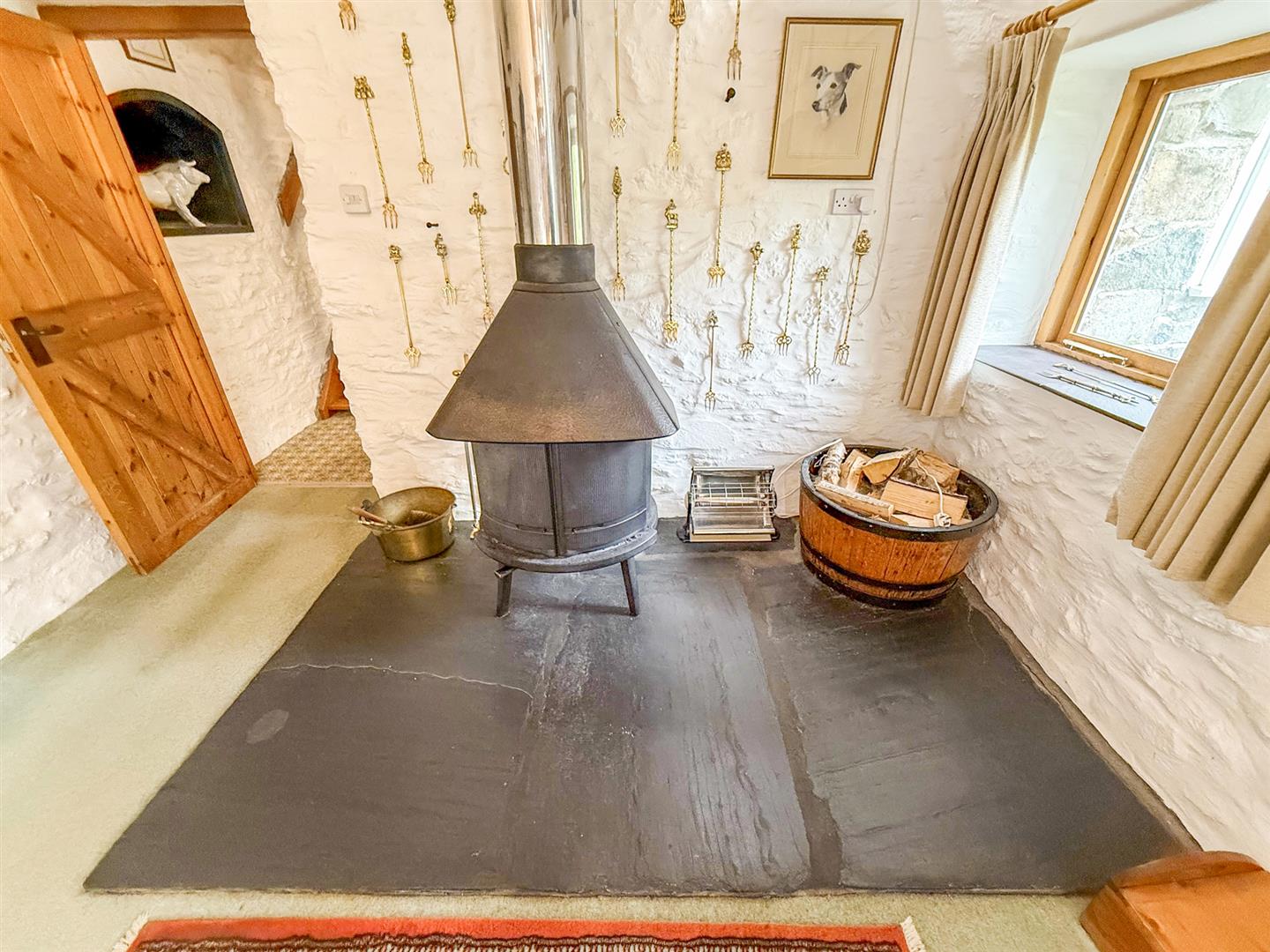 The spacious vaulted lounge a large full height window to the front and a second window to the front overlooking the garden and views, a glazed door to the front, storage heater, fitted shelving and storage, exposed stonework and a focal log burning stove on a slate hearth.