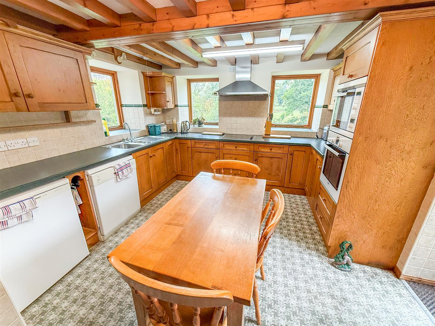 The kitchen has two windows to the front overlooking the gardens and hills beyond , a window to the side, part glazed door to the side. With wall and base units, eye level Bosch electric oven, microwave/combi grill, Bosch ceramic hob, space for a dishwasher and fridge. A one and half sink bowl with mixer tap, part tiled walls, beamed ceiling, a chimney extractor fan, a pantry off with shelving and a storage heater.