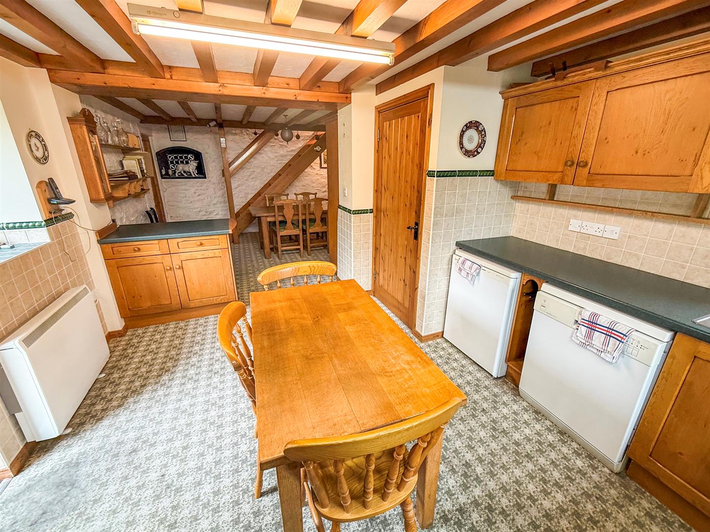 The dining room has exposed stonework, stairs leading off to the first floor, beamed ceiling, storage heater and built in storage cupboards. The dining room opens out onto the kitchen making it a great space to entertain and cook. A door leads through to the lounge.
