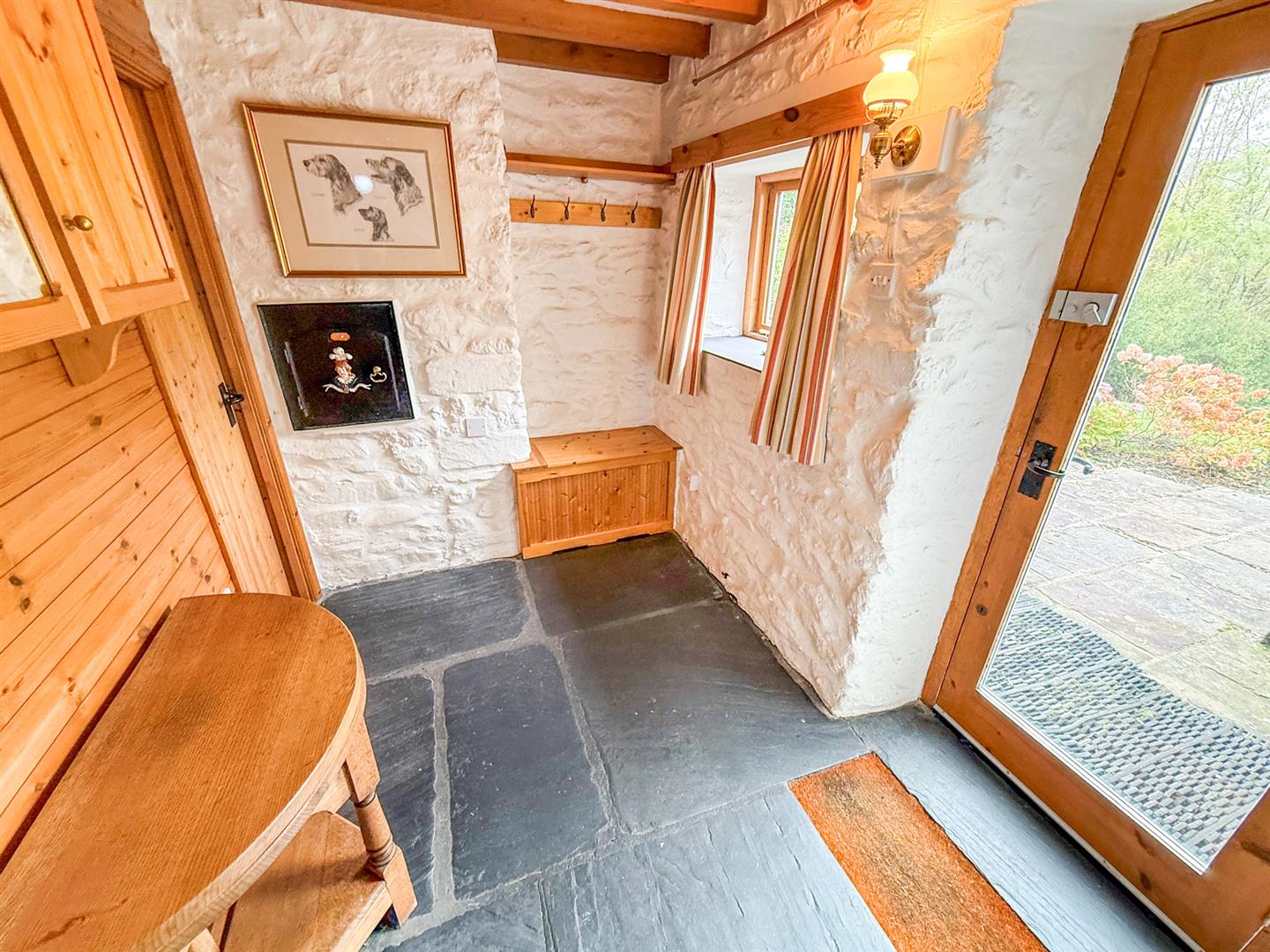 The hallway has a slate flagged floor, glazed door to the front and a window to the front. With wall lights, beamed ceiling and exposed brickwork. Doors lead to the dining room and the bathroom.