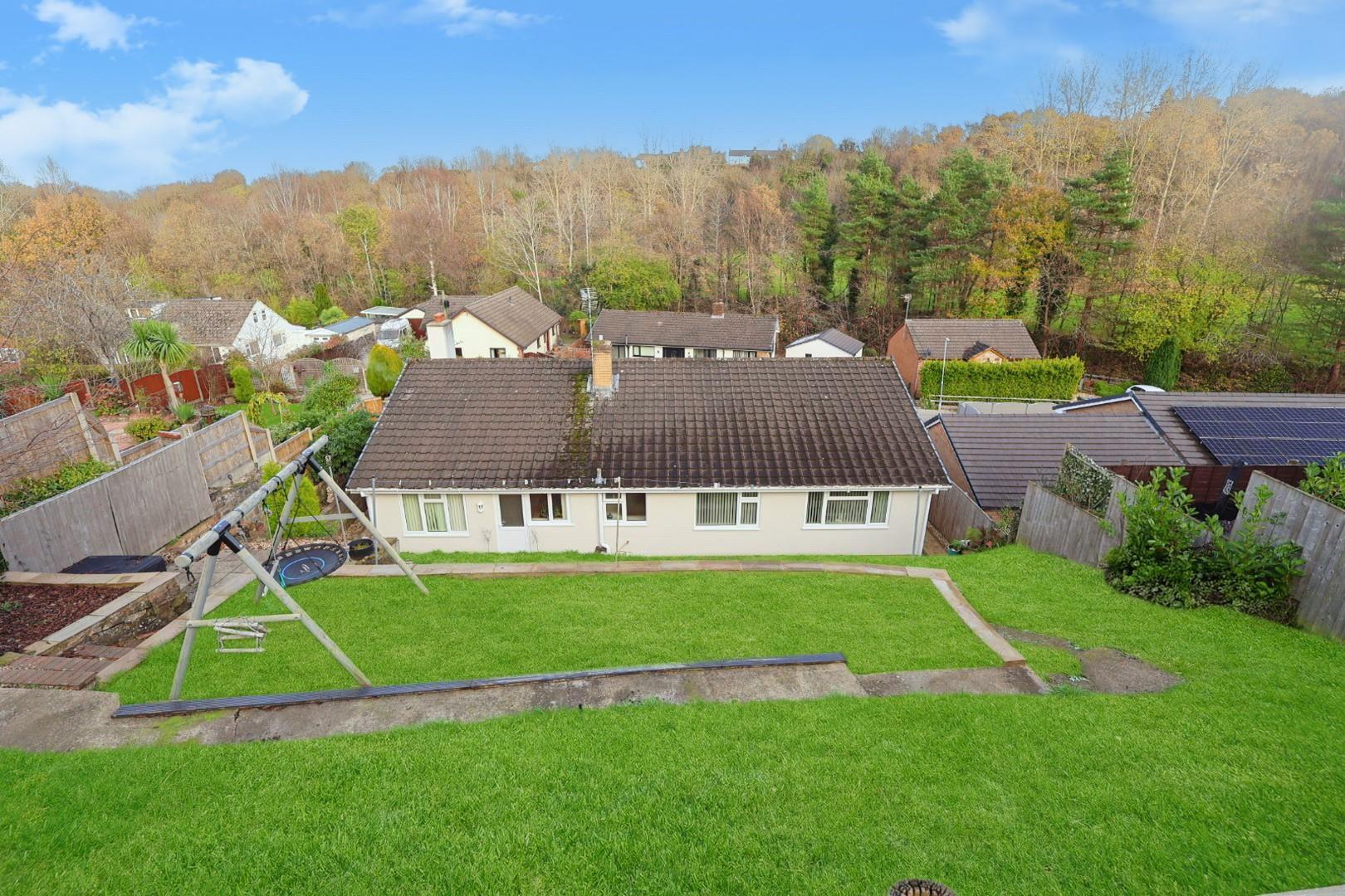 To the rear a timber side gate leads to a tiered rear garden with paved path and lower seating area. Steps rise along the right side past lawned tiers and an ornamental pond to a higher level where a gate provides access to additional off-road parking and the property’s annex.