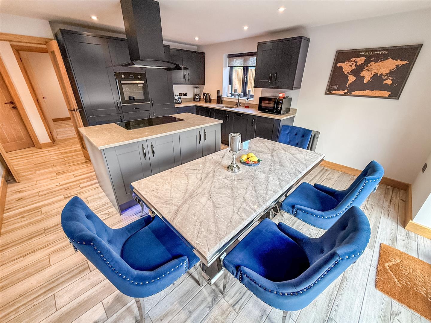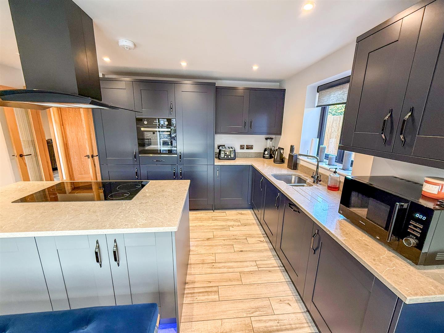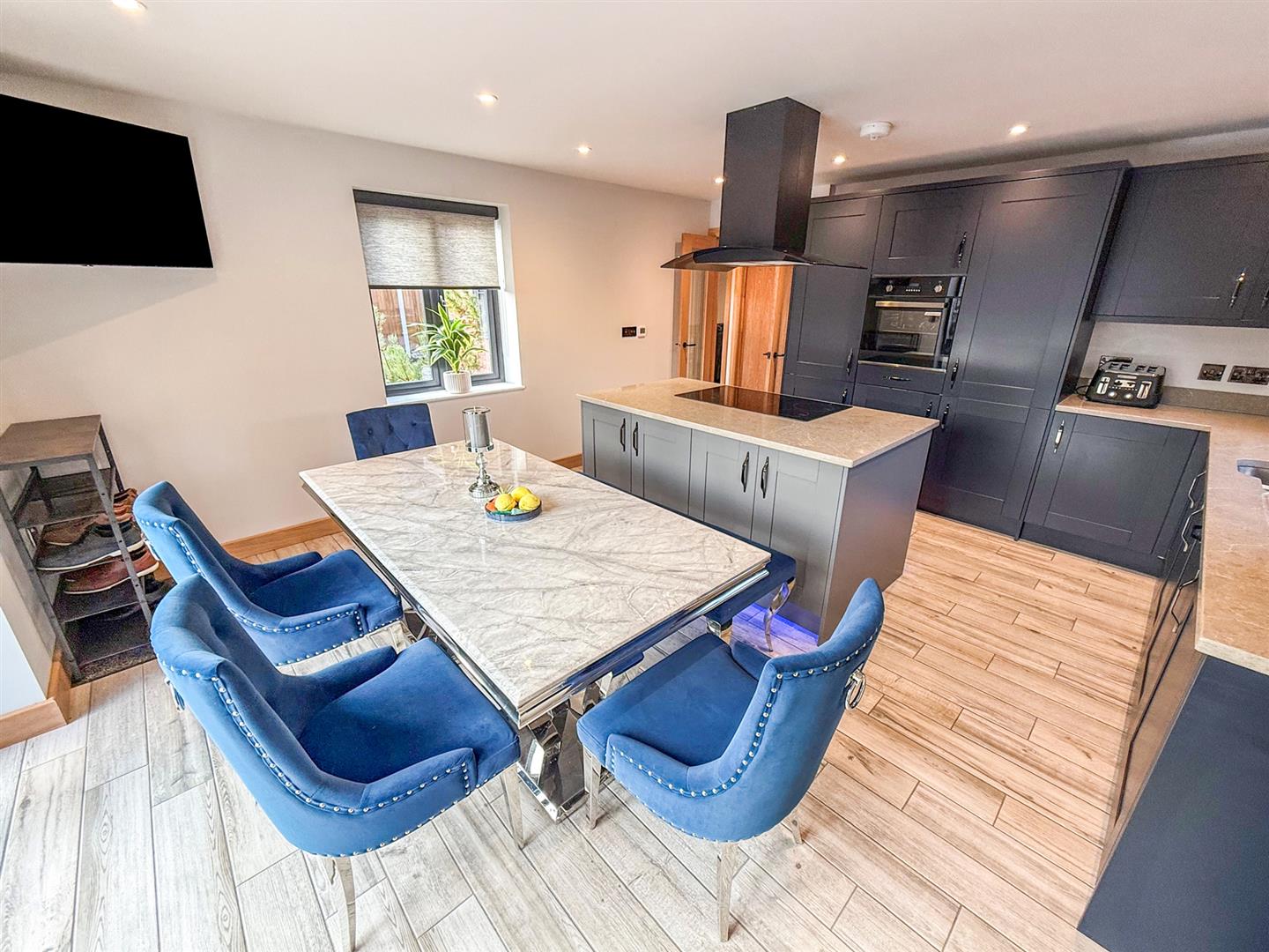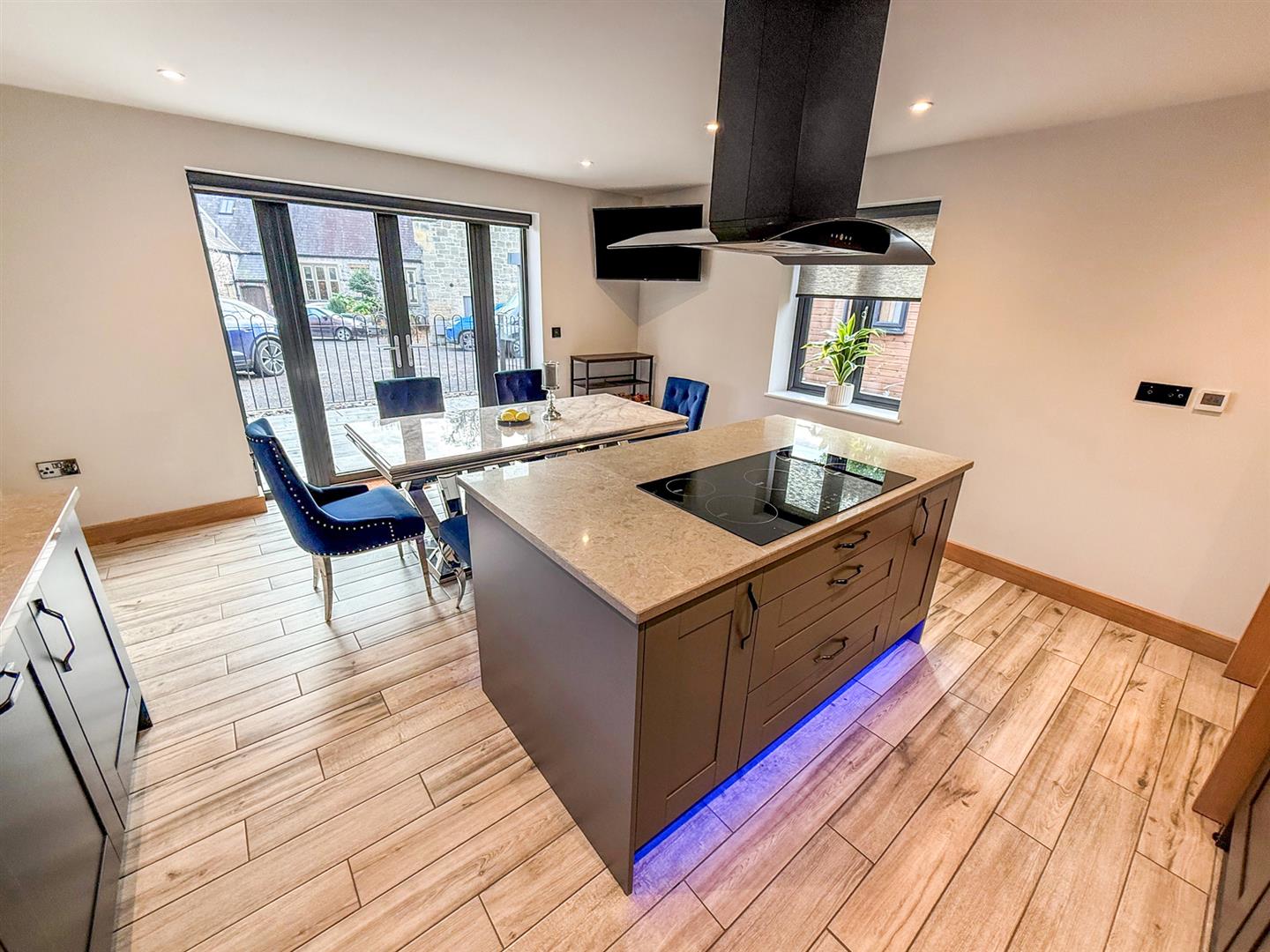 The beautifully appointed kitchen/ dining room is the real heart of this stunning home. Fitted with a good range of high quality base and wall units in a modern blue tone with contrasting courts work surfaces over, a central island with a 5 ring induction hob, plinth lighting and chimney style extractor fan over, spotlighting and tiled flooring with underfloor heating, Bi fold doors leading out to the front and two windows to the side. Appliances include integrated fridge-freezer, eye level electric oven and dishwasher.