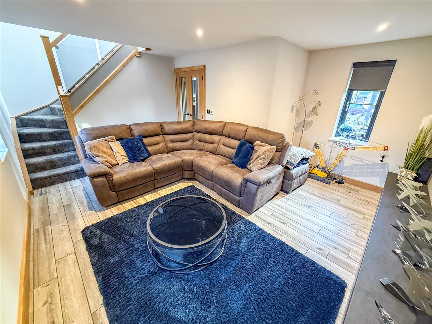 The good sized L shaped lounge has two windows to the rear and one to the front, tiled flooring with under floor heating, spotlighting and a built in media unit with storage. The stairs lead off to the first floor with an oak and glass banister and hand rail.