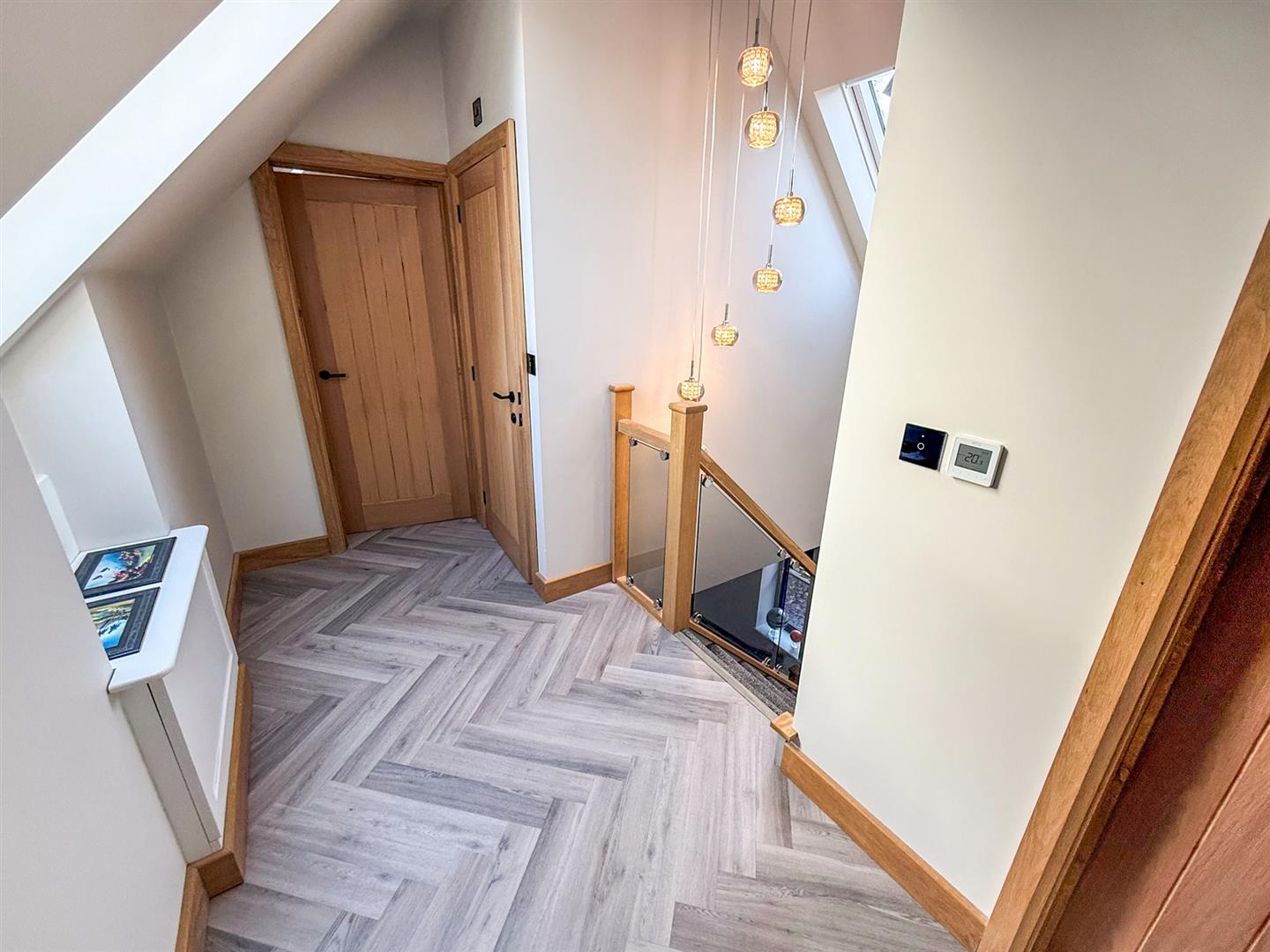 The bright and airy first floor landing has a Velux to the front and the rear, continuation of the glass and oak staircase wood effect flooring, underfloor heating and doors leading to all the first floor rooms.