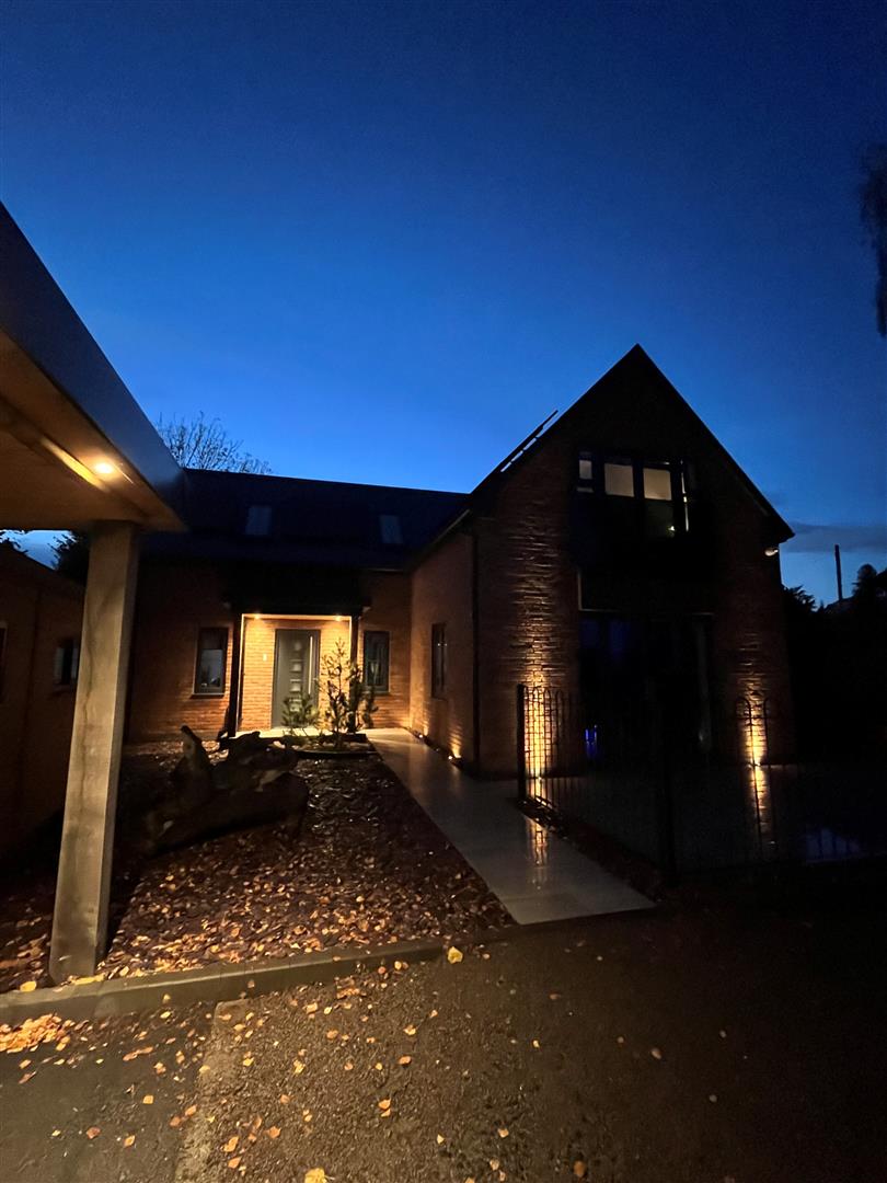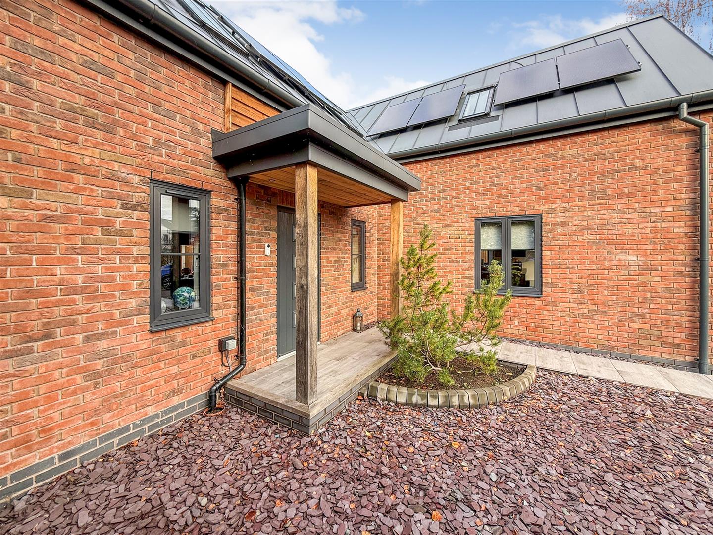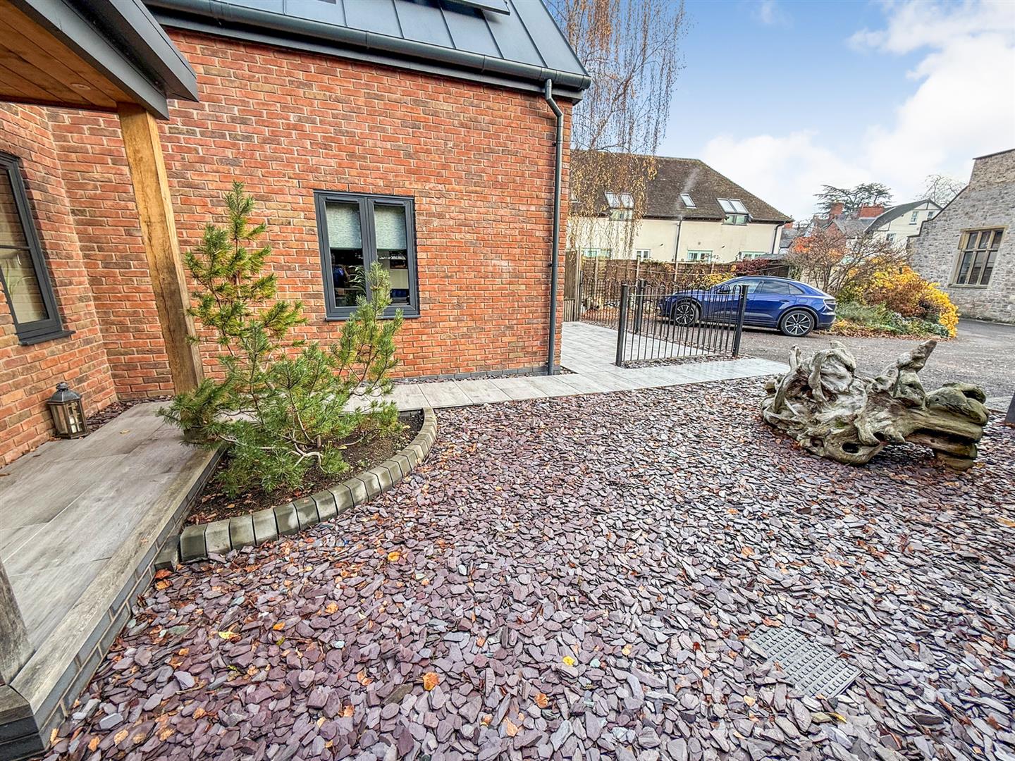 To the front of the property there is an oak porch with lighting leading to the front door. The gardens are mainly laid to slate making them very easy to maintain. There are raised beds and a seating area with attractive wrought iron fencing to the boundary A porcelain pathway leads through the garden to the front door.