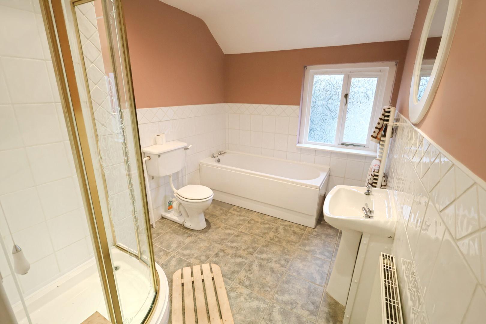 A generous sized bathroom fitted with a four-piece white suite comprising a panelled bath, corner shower enclosure with thermostatic shower, pedestal wash hand basin and low-level WC.