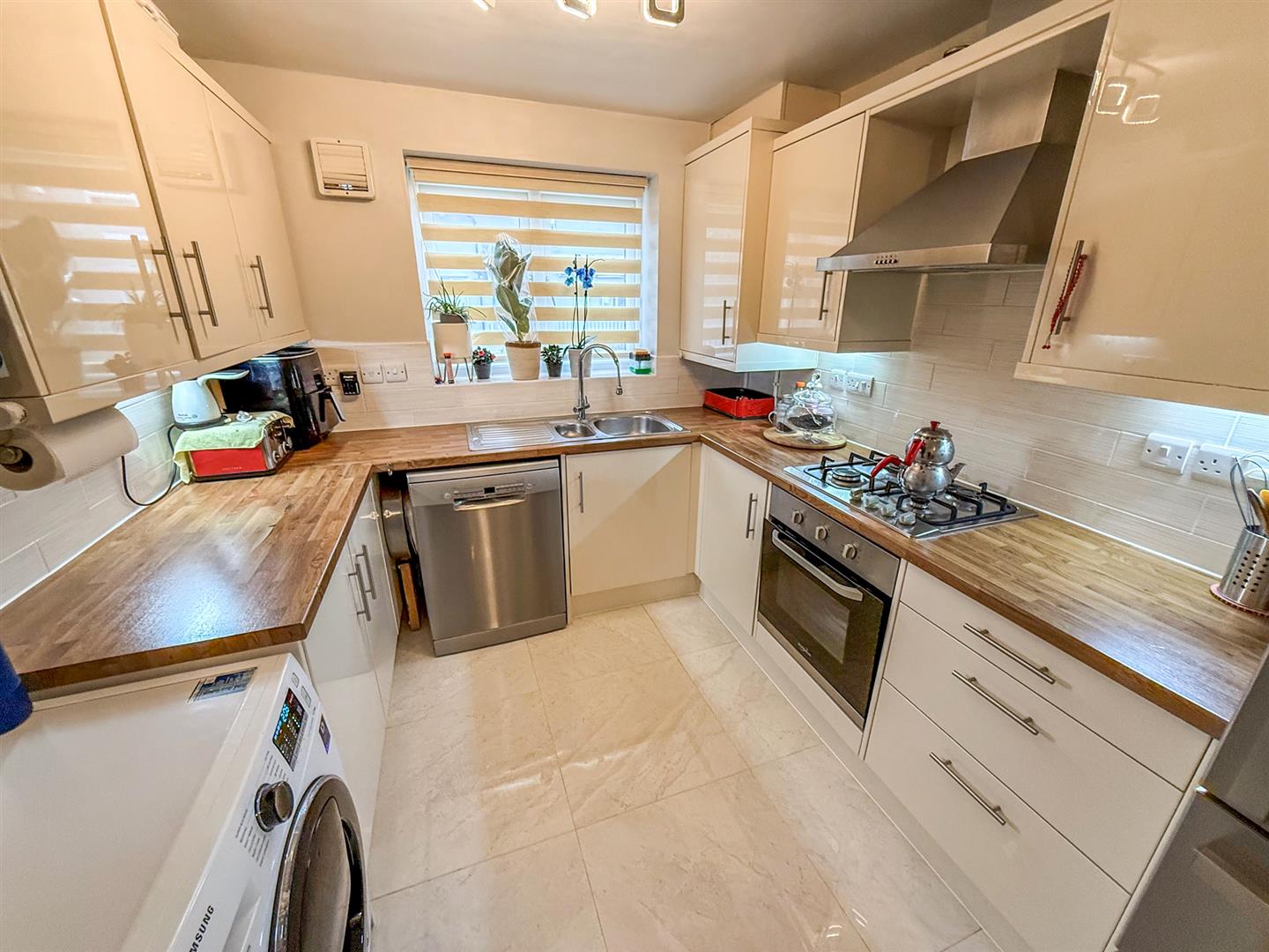 The superb kitchen/ dining room is fitted with a modern range of gloss fronted wall and base units with contrasting oak block style work surfaces over, a window to the front, part tiled walls, plumbing for a washing machine, plumbing for a dishwasher, one and a half bowl sink with a mixer tap over, under unit lighting, built in electric oven, gas hob, chimney style extractor fan, space for a fridge/ freezer, radiator and upgraded marble effect tiled flooring.