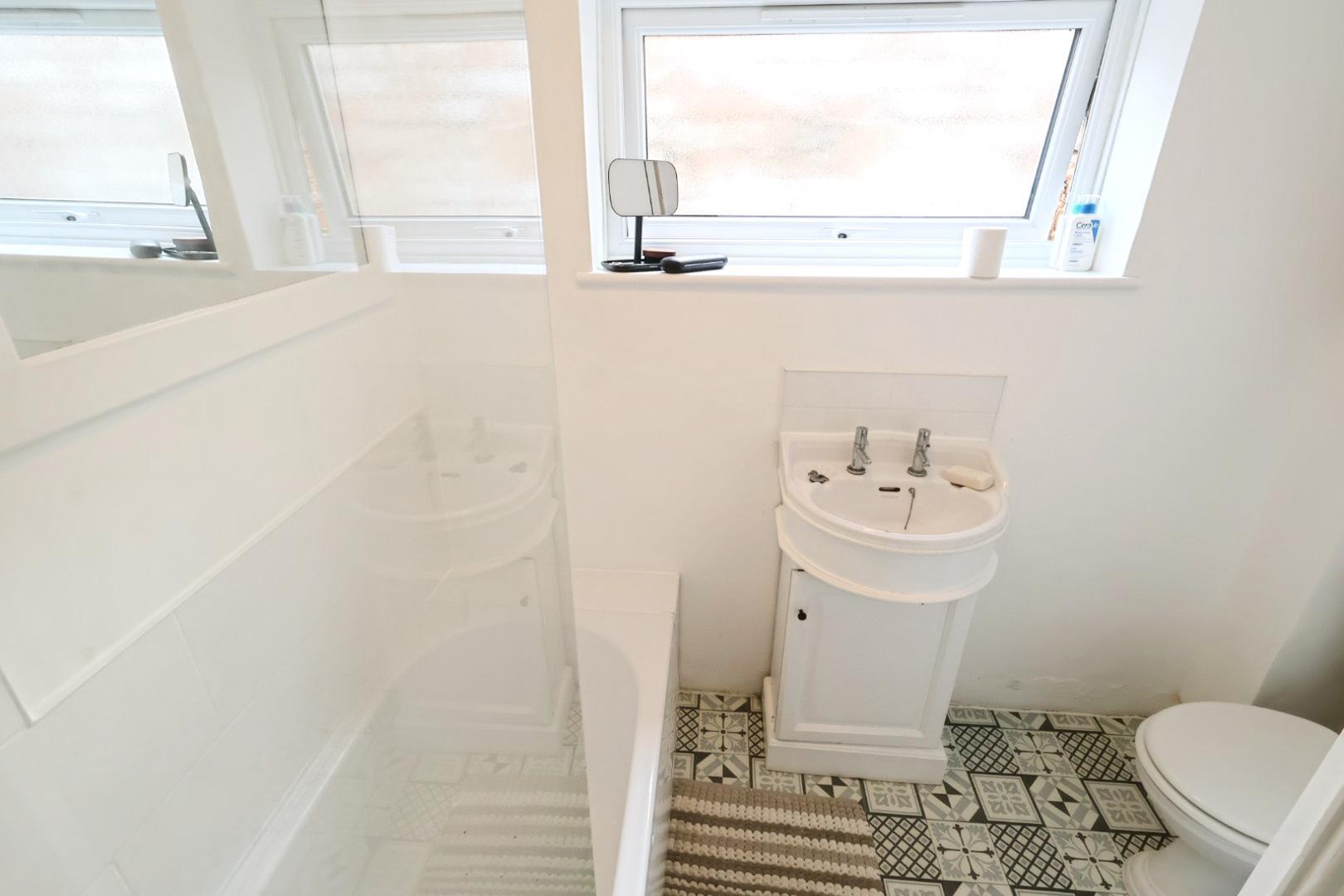 The bathroom is fitted with a modern white suite comprising a panelled bath with mixer tap, shower extension, and protective screen. A vanity unit houses a wash hand basin, and there is a low-level WC. Additional features include a radiator, partially tiled walls, a fitted cabinet housing the Worcester gas combination boiler, and an opaque window to the rear elevation.