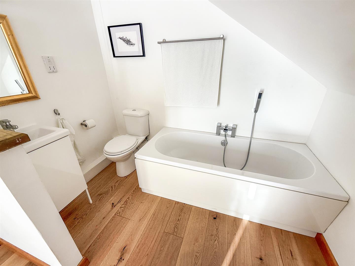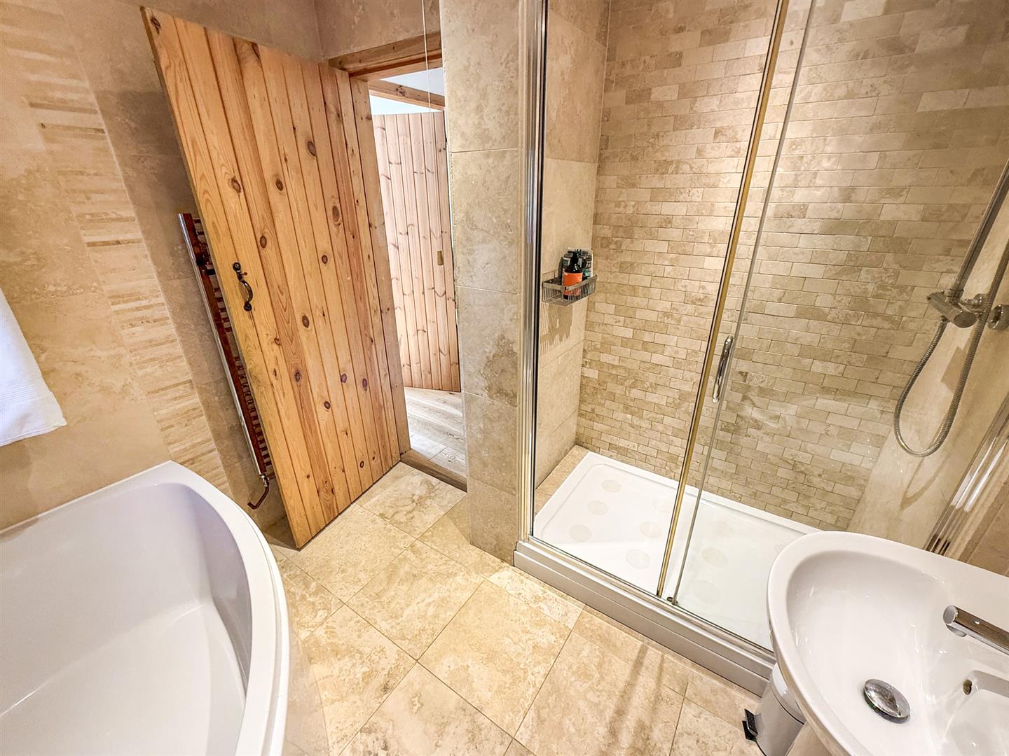 The well appointed family bathroom has a white bathroom suite comprising a corner panel bath with mixer tap and shower attachment, wash hand basin and WC. Double width shower cubicle with two shower head attachments, tiled walls and floor, shaver point and extractor fan. Heated towel rail and arrow slit style window.