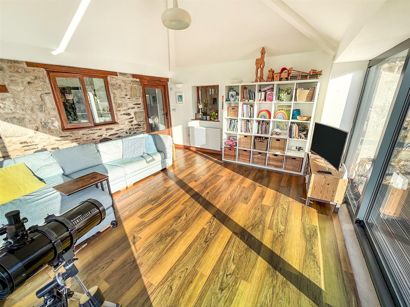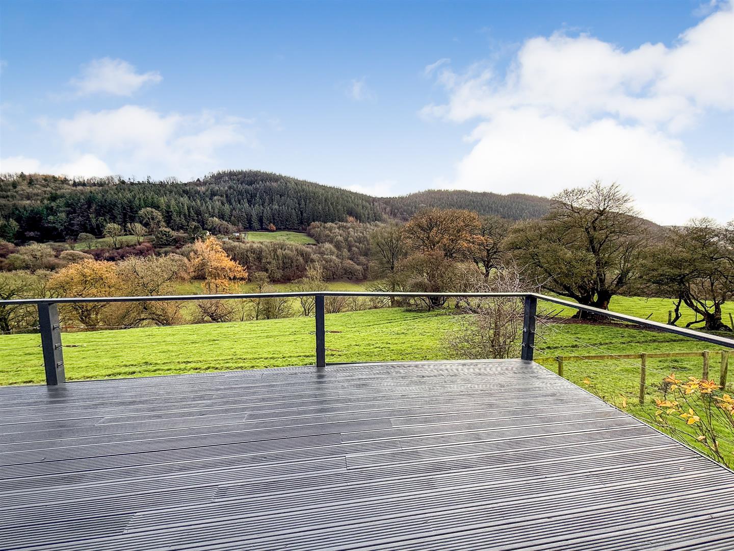 The good sized living room is bright and filled with light having double glazed patio doors and large panoramic windows with thin aluminium frames to maximise the stunning view and leads out to a decked patio area which enjoys far reaching countryside views of the valley, exposed stonework walling, wood effect flooring and a radiator.