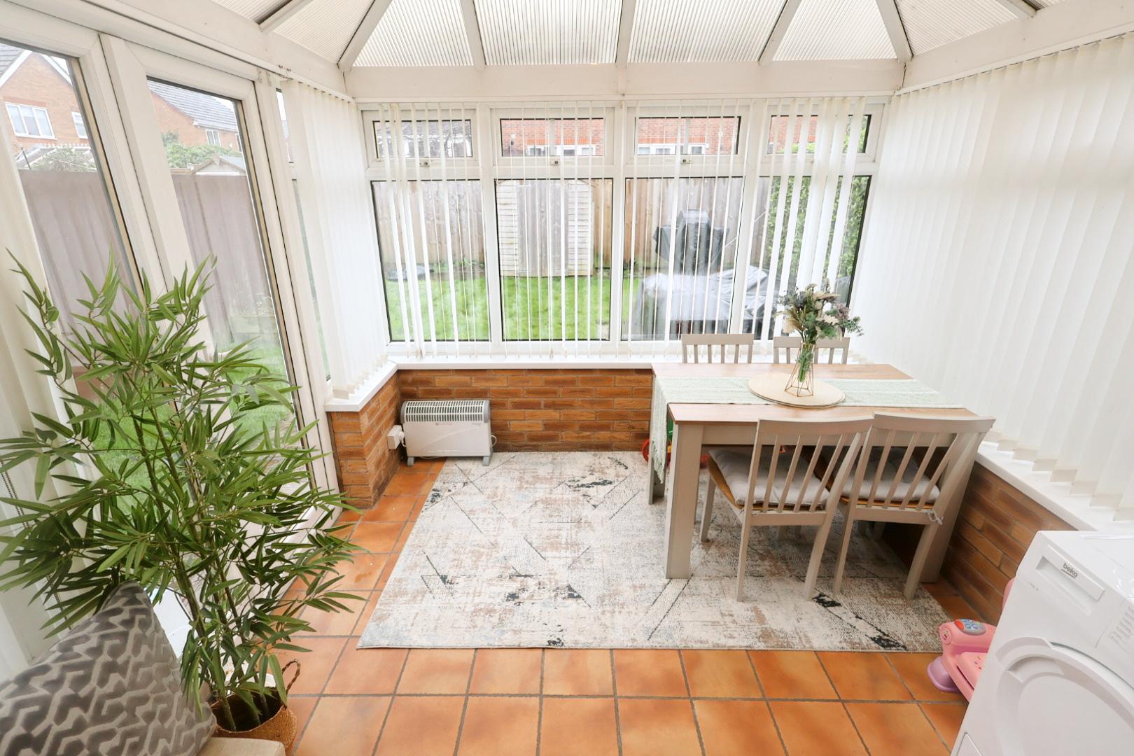 The kitchen/dining room continues the wood-grain effect laminate flooring and features a radiator, under-stairs storage cupboard, a window to the rear elevation, and a patio door opening into the conservatory. The kitchen is fitted with an attractive range of light wood-grain effect shaker-style wall, base, and drawer units, complemented by stainless steel handles. Integrated appliances include a stainless-steel oven, hob, extractor hood, dishwasher, washing machine, and housing for the Worcester gas combination boiler.