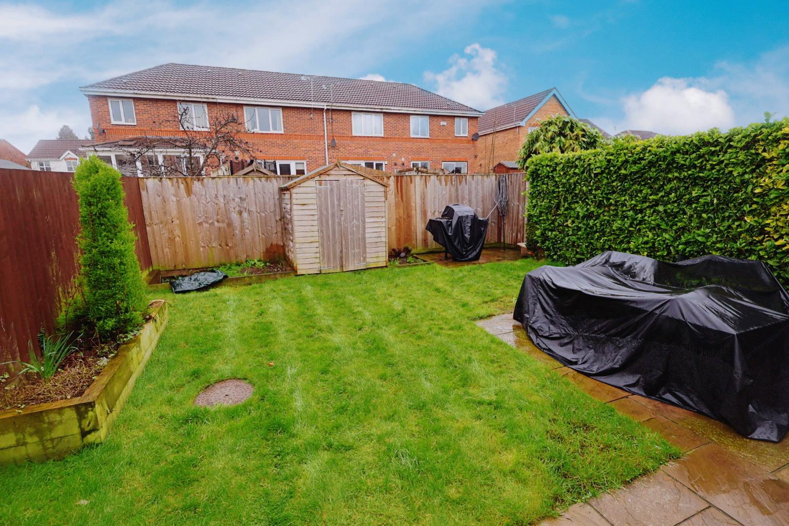 The property offers a lawned front garden with paved pathway, an additional parking space, and a driveway to the left-hand side leading to a timber-gated rear garden. The rear garden enjoys a sunny south-westerly aspect and is predominantly laid to lawn with a paved patio area, sleeper-style raised planters, and a timber shed. The garden is enclosed by a combination of timber fencing and hedging and includes an external water supply.
