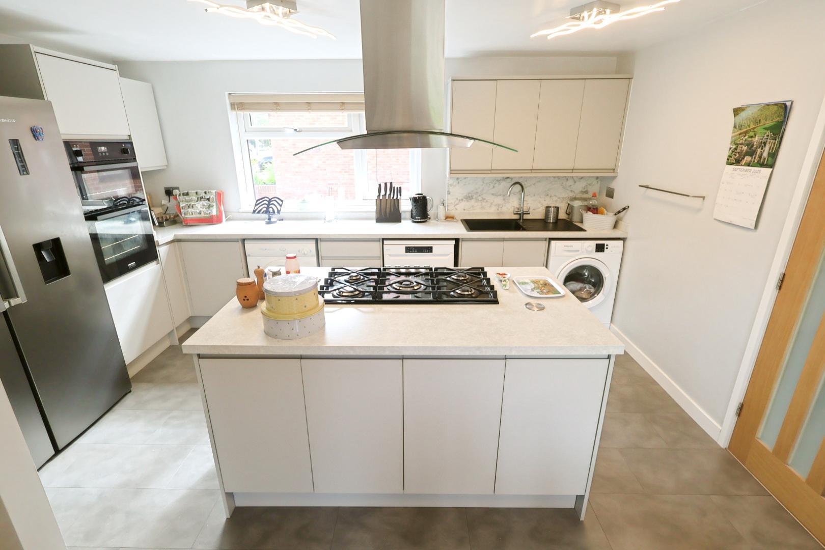 Fitted with a range of contemporary wall, base and drawer units with matching island unit. Ample work surfaces incorporate a single drainer sink with mixer tap. Integrated appliances include a four-ring gas hob set within the island with a stainless steel and glass canopy extractor above, and a built-in double oven. Space and plumbing are provided for a washing machine, dishwasher, and dryer. The breakfast area includes a radiator, UPVC double-glazed French doors opening to the garden, and a front-facing window.