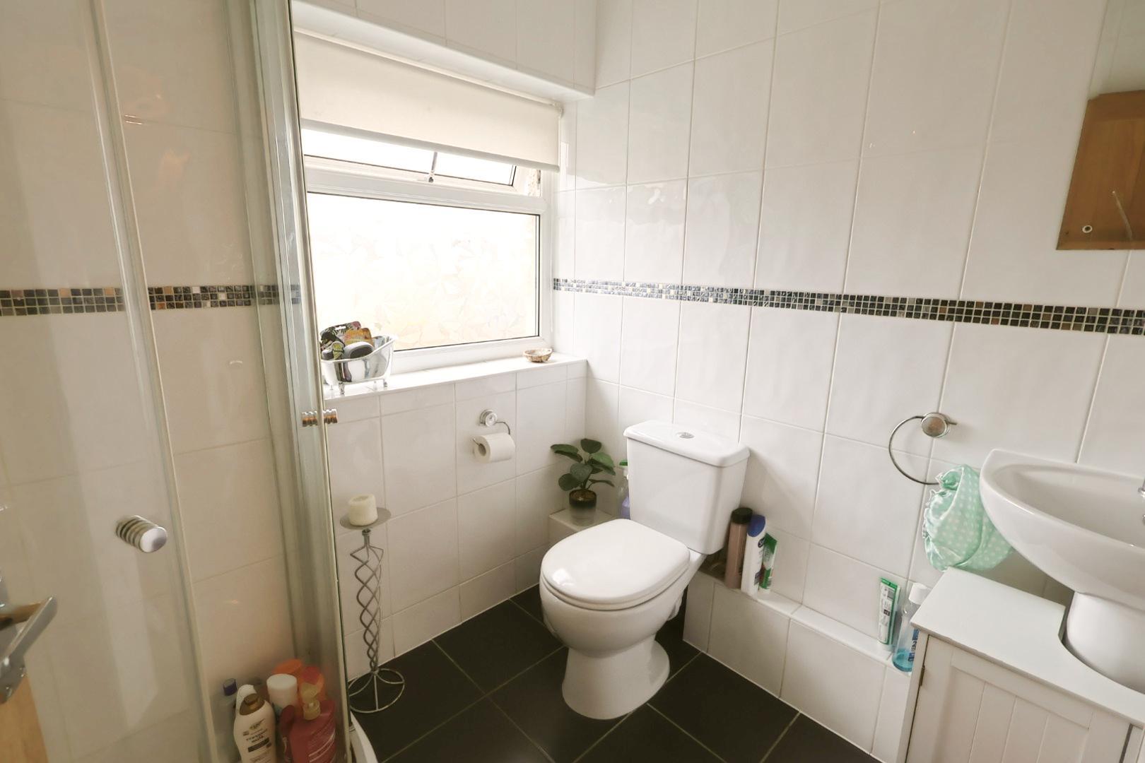 The shower room is fitted with a modern three-piece white suite comprising a corner shower enclosure with electric shower, a dual-flush low-level WC, and a pedestal wash hand basin. The flooring is ceramic tiled, the walls are fully tiled, and there is an opaque window to the front elevation.