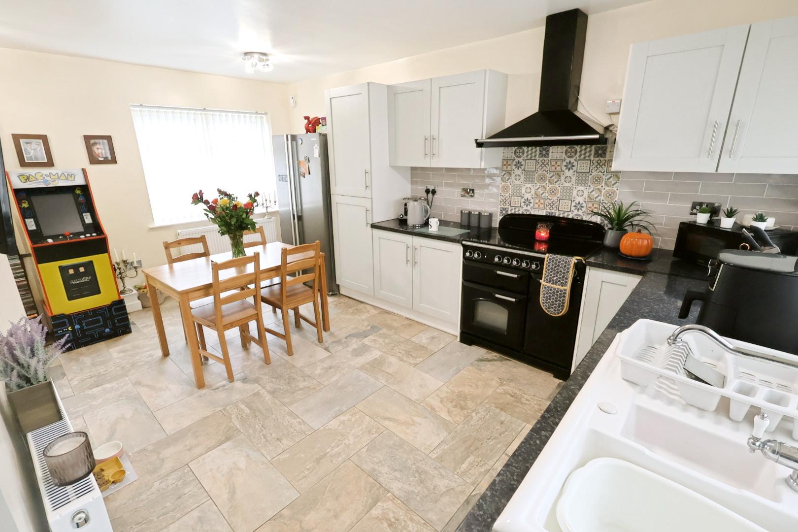 With a continuation of the ceramic tiled flooring, this kitchen features two radiators, a window facing the front elevation, and two windows facing the rear elevation. There is an understairs storage cupboard, a meter cupboard, and a partially glazed door opening into the utility room. The kitchen area is fitted with a range of light grey wood-grain effect shaker-style wall and base units, complemented by stainless steel handles and work surface space housing a ceramic one-and-a-half bowl sink unit with mixer tap and tiled splashback. There is space for a range cooker with extractor hood above, along with space and plumbing for a dishwasher.