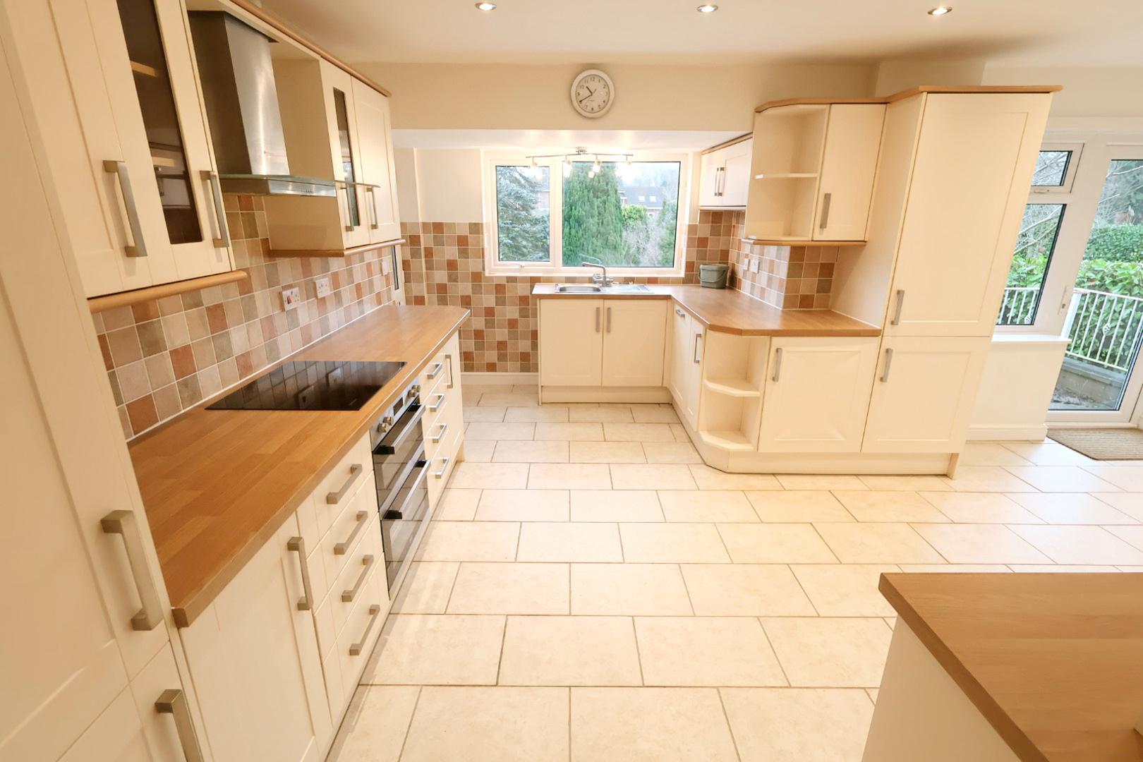 A spacious kitchen/dining room with ceramic tiled flooring throughout. Windows face the rear and side elevations, and an opaque UPVC double glazed door opens onto the elevated rear seating area. The kitchen is fitted with a range of cream shaker-style wall, base and drawer units with stainless steel handles, display cabinets and wood-grain effect work surfaces. There is a stainless steel single drainer sink with mixer tap and tiled splashbacks. Integrated appliances include a stainless steel double oven, hob with extractor hood above, dishwasher, fridge and freezer. A cupboard houses the gas combination boiler. Recessed ceiling downlights complete the space.
