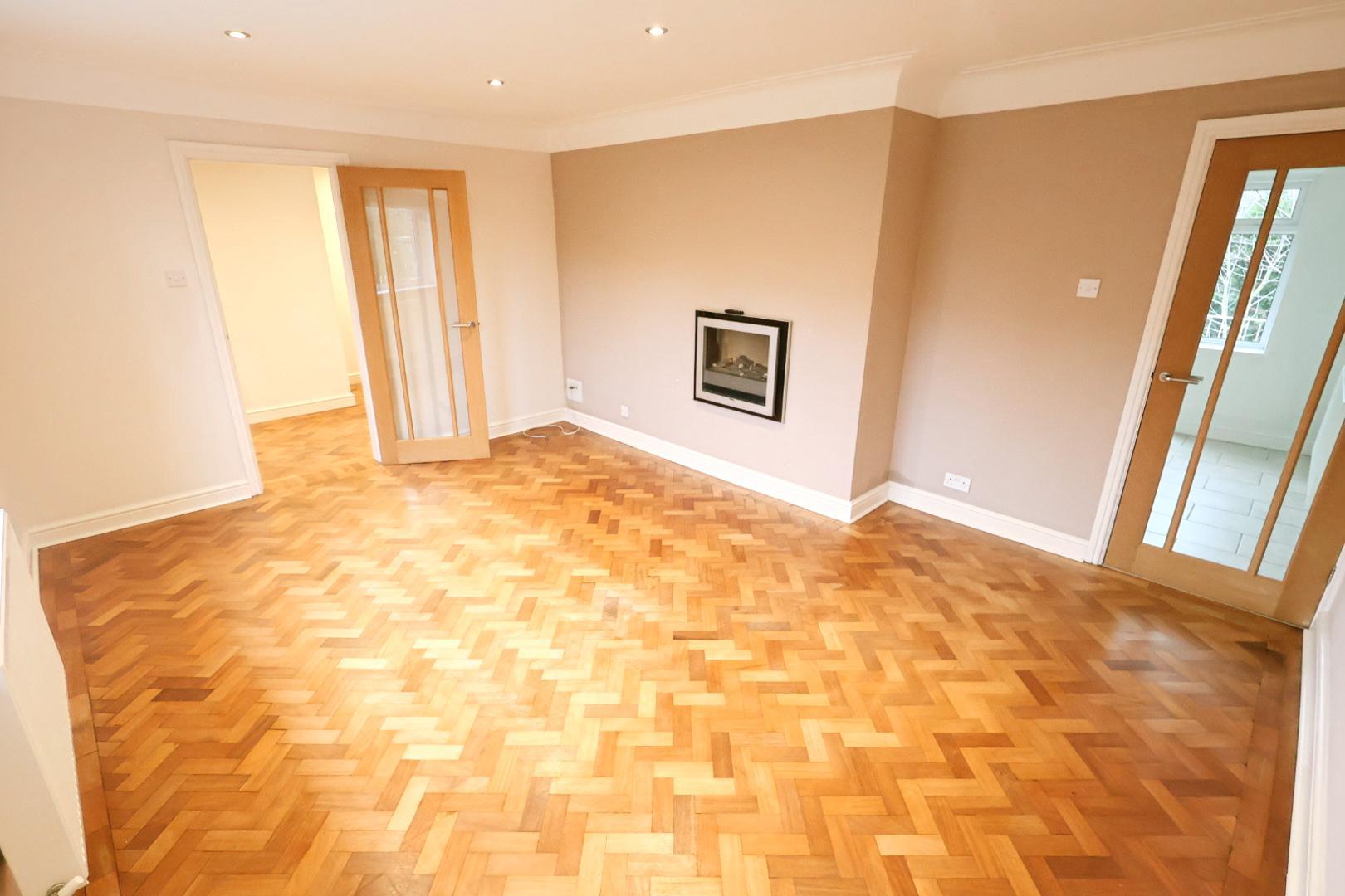With continuation of the parquet flooring from the entrance hall, this well-proportioned living room features a wall-mounted log-effect electric fire with remote control, recessed ceiling downlights, and a window to the front elevation with a radiator beneath. A partially glazed light oak door opens to the kitchen/dining room.