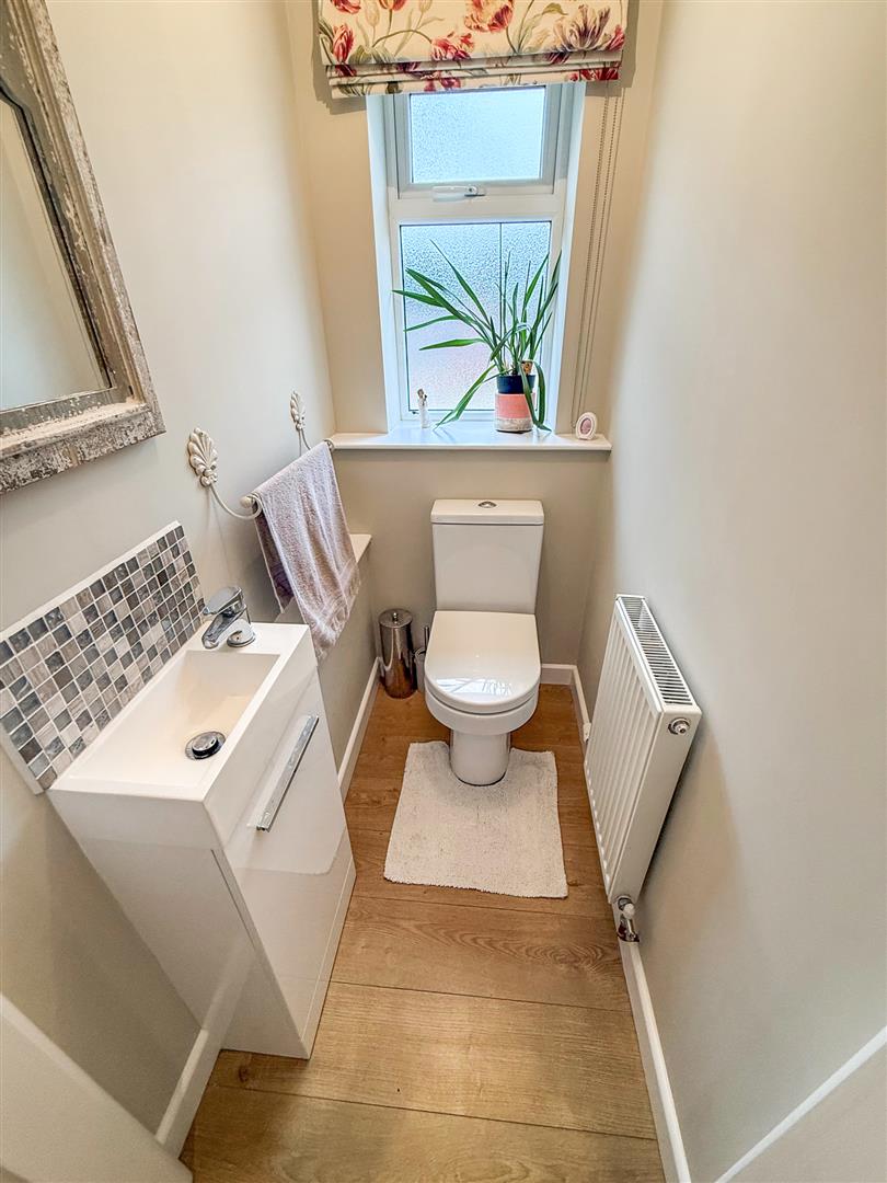 The cloak room has a window to the front, a w/c, a wash hand basin on a vanity with a mixer tap over, a radiator and wood floor.