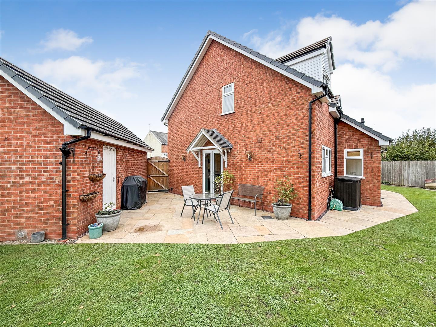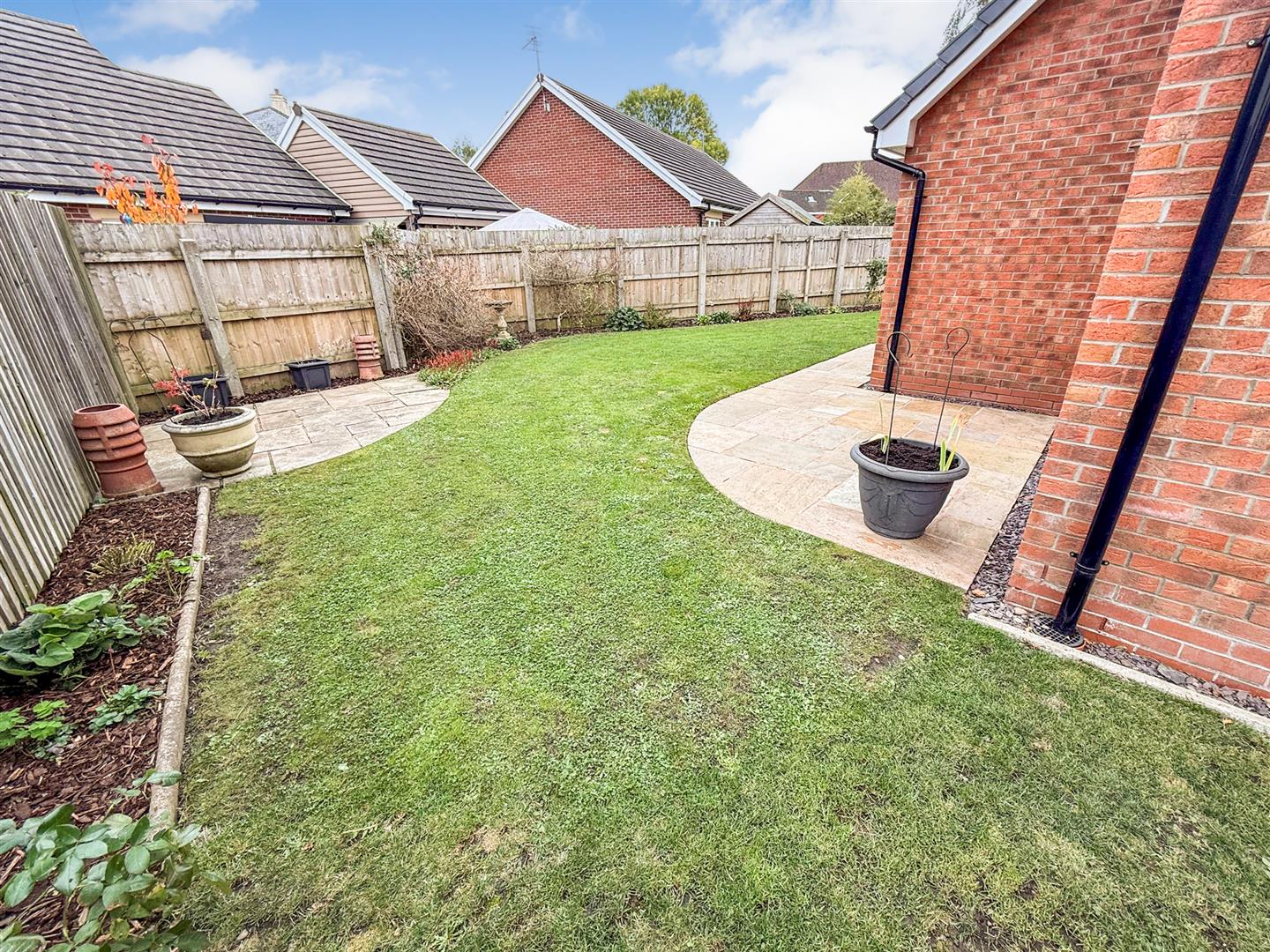 The good sized South facing rear garden and courtyard wraps around the property and has an Indian stone patio located both off the kitchen and the sitting room. There is a canopy over the French doors to the side with lighting, extensive lawned area with shrubbed flower beds, fence panelling to the boundaries making it ideal for children and pets, an outside tap, two additional patio areas and a side storage shed behind the garage.