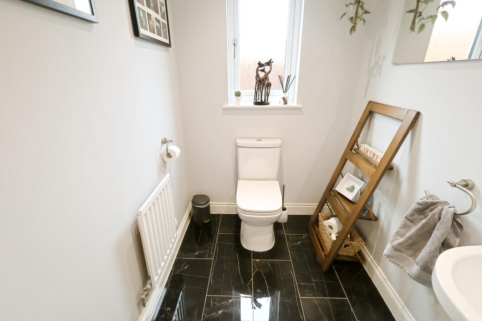 Fitted with ceramic tiled flooring, radiator, opaque rear-facing window and recessed ceiling downlights. Installed with a dual-flush low-level WC and corner wash-hand basin with tiled splashback.